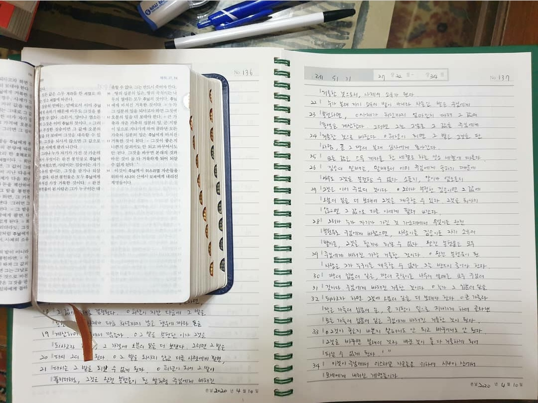 일주일에 3~4일, 30분 정도씩 필사했다. 구약은 정말 길어서 끝이 보이지 않지만 할 수 있는 만큼씩만 하려고 한다.