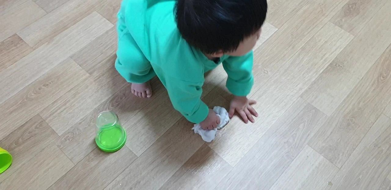 코 파는 것 외에도 최근에 바람직한 모방 행동을 보인 적도 있었다. 가제손수건으로 바닥 닦는 시늉을 한다던가, 돌돌이로 먼지 닦는 시늉을 했다. 그럴 때면 '요 녀석 봐라? 잘 키우면 쏠쏠하게 도움이 되겠는 걸?' 하며 앞으로 분담할 집안일을 기분 좋게 상상해보기도 했다.