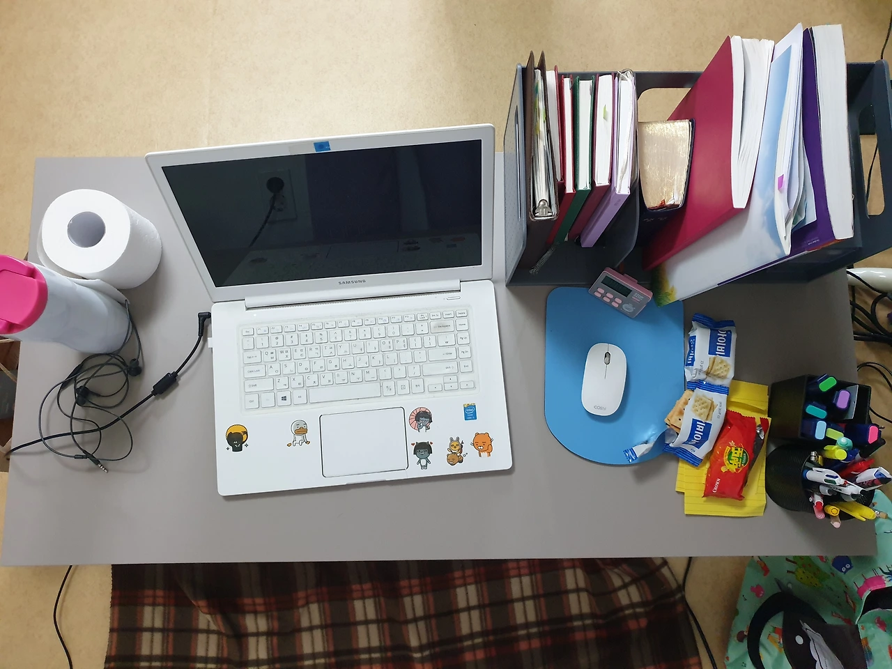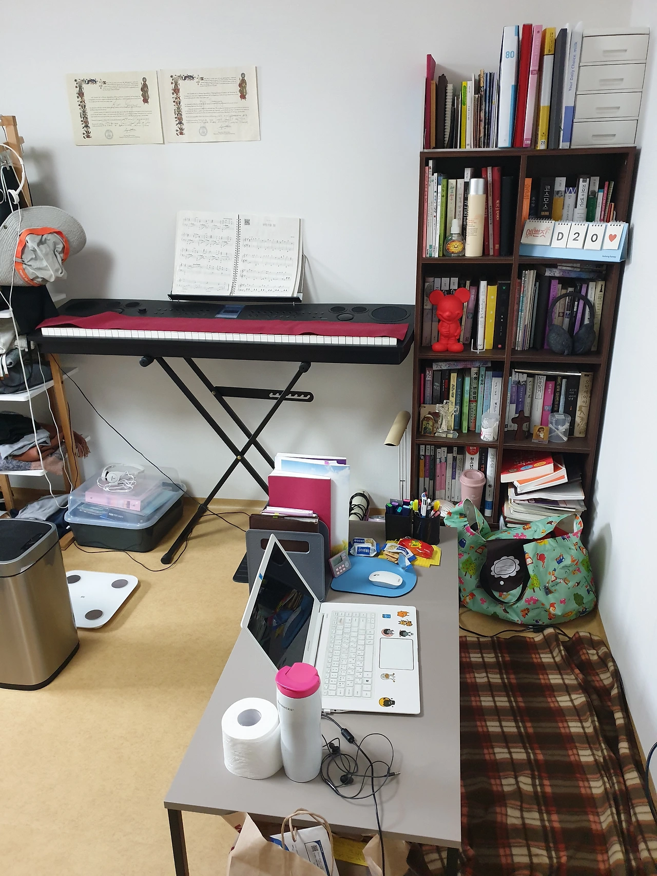 그렇게 남편의 통 큰 양보로 결국 내 방이 생겼다. 내 방이라고 하지만 사실 내 물건은 방 한구석에만 자리한다. 문을 열고 들어가면 오른쪽 귀퉁이에 좌식 책상과 책장과 피아노 키보드가 놓여있다. 나머지 공간은 남편과 함께 드레스룸으로도 쓰고 아기에게 위험한 물건을 치워놓는 공간으로도 쓴다.