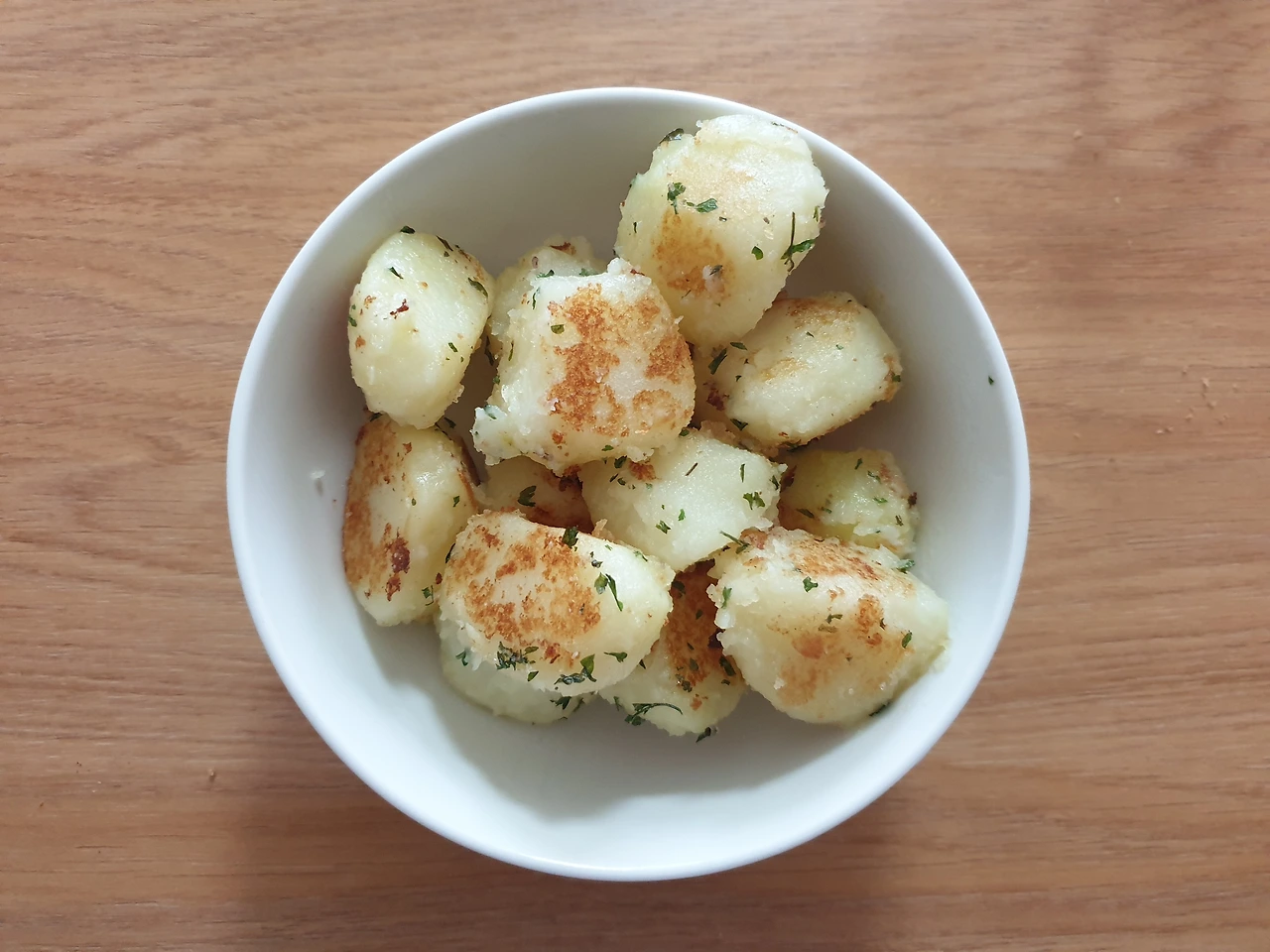 남편도 좋아한 채식요리, 알감자 버터구이. (팬을 흔들어서 구워야 한다는데 주걱으로 뒤적거렸더니 모양이 이렇게 됐다)