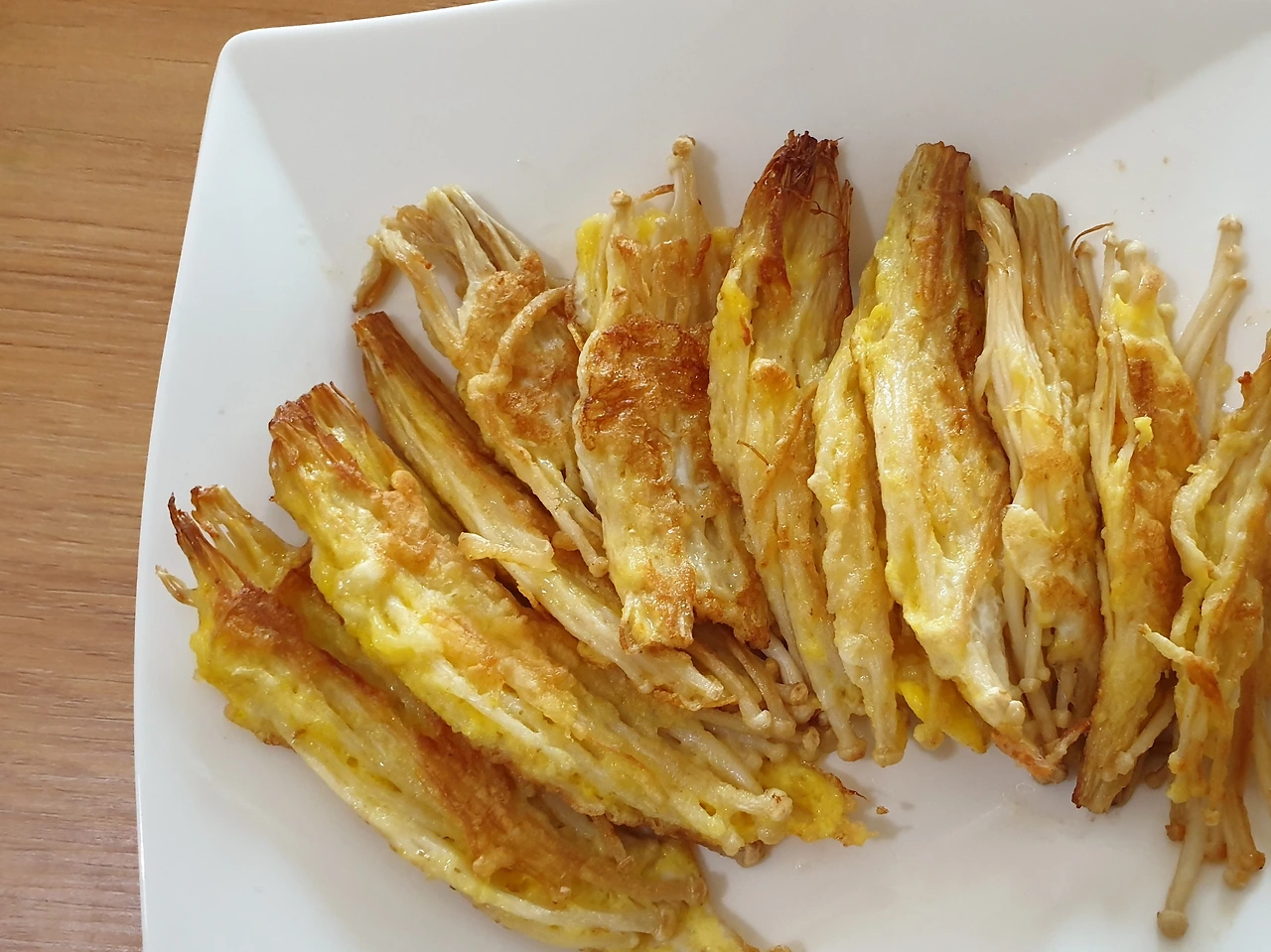 또 팽이버섯전도 이번에 얻은 수확 중 하나다. 이것도 만들기가 쉽다. 한입 크기로 나눈 팽이버섯에 밀가루를 얇게 뿌린 다음 달걀물에 적셔 노릇하게 부치면 완성이다. 베어 물 때의 식감과 향이 말도 못 한다.
