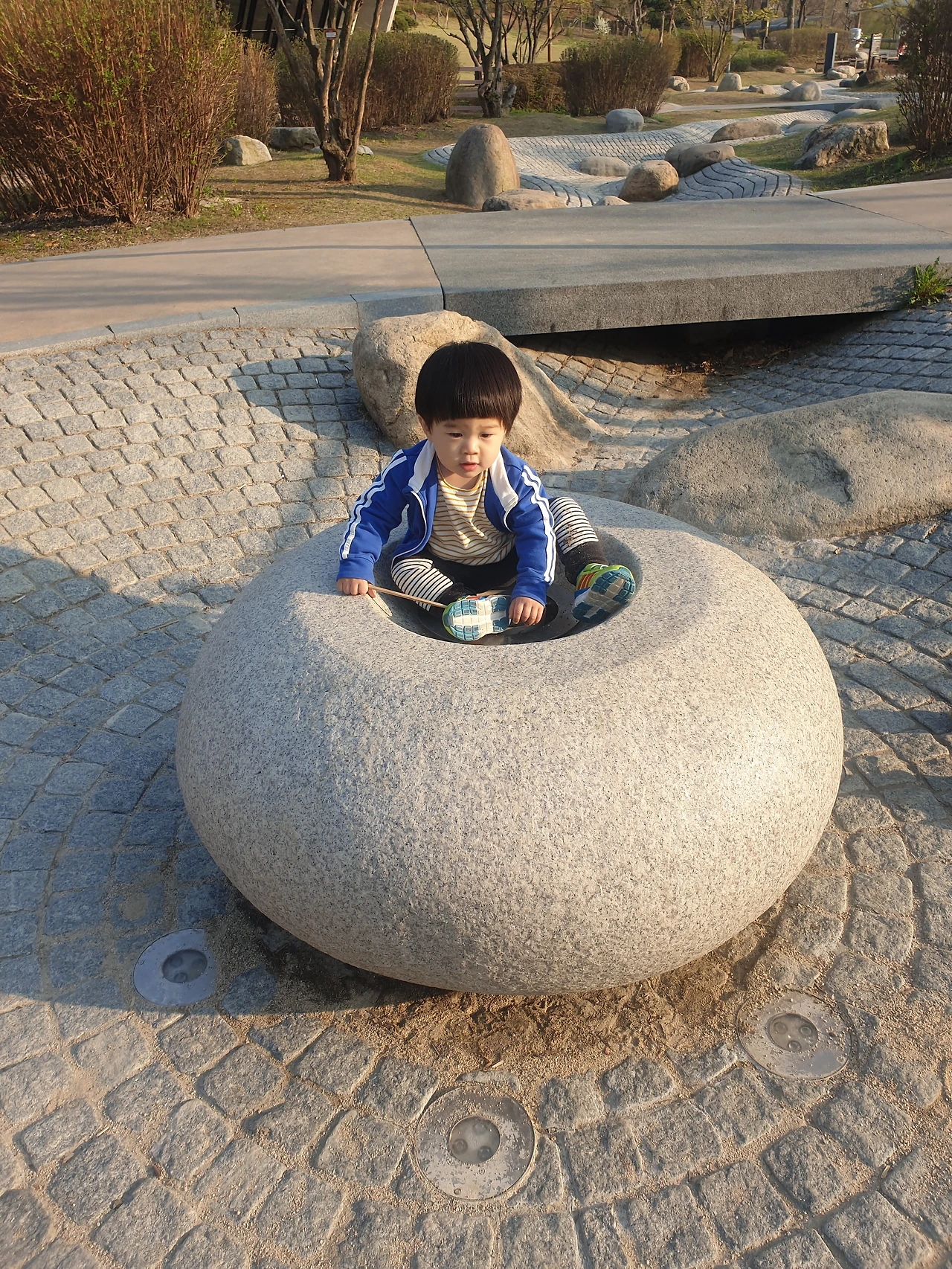 "맘처럼 안 되네." 모래놀이가 하고 싶은 건 나 혼자뿐이었나보다. 호야는 뭘 탐색하려는 건지는 몰라도 잔디밭 위를 뛰어다니다가 큰 돌 위를 기어오르고, 돌길 위를 뛰다가 바닥에 있는 나뭇가지를 줍고 휘둘러대는 등 맥락 없는 달음질을 이어갔다. 그러는 동안 남편과 나는 호야가 넘어지거나 다치지 않도록 쫓아다니고 붙잡느라 기진맥진했다.