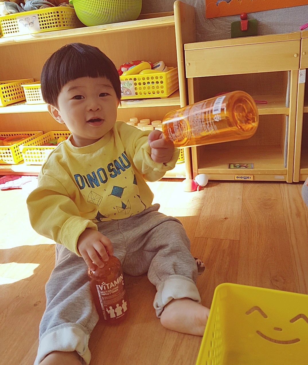 둘째로 말이 많이 늘었다. 어린이집을 가기 전에는 엄마, 아빠, 맘마, 무(물), 까까, 배, 딸기 정도를 말했다면, 지금은 안녕, 빠빠(빠이빠이), 싸뚜(싹뚝), 짠, 뻐뻐(뽀뽀)를 상황에 따라 말하고 쩨짤(3살)이나 때찌때찌 같은 말들을 따라 한다. 또 옹알이를 문장처럼 말하면서 혼자 고개를 끄덕이기도 하고 뭔가를 물어보는 표정을 짓기도 한다. 한글로 받아 적기 힘든 옹알이지만 굳이 비슷하게 쓰자면 "따아따아~ 또똥.. 땡긍응드~ 꾸꾸.. 따끙! ..꺄끄~ 땨" 이런 말들인데 중국어 4성 같은 억양이 있어 무척 귀엽다. 선생님이나 친구들이 말하는 걸 많이 들어서 흉내 내는 것 같다. 친구라고는 해도 많게는 10개월, 적게는 5개월이 빠른 아기들이라 호야보다 다들 말을 잘하기 때문에 배울 수 있는 장점이 있다(처음에는 개월 수가 가장 적은 게 걱정거리였지만 이 점에서는 오히려 도움이 됐다).