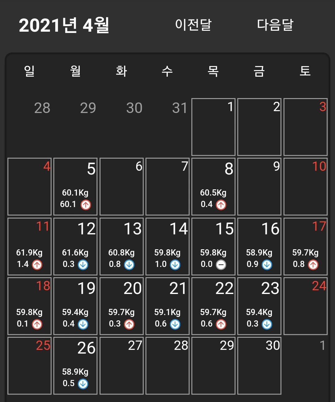 둘째 주(4/12~4/18)는 충격을 받아 두 끼를 굶고 먹는 양을 반으로 줄였더니 그 주에 58.9kg을 찍었다.