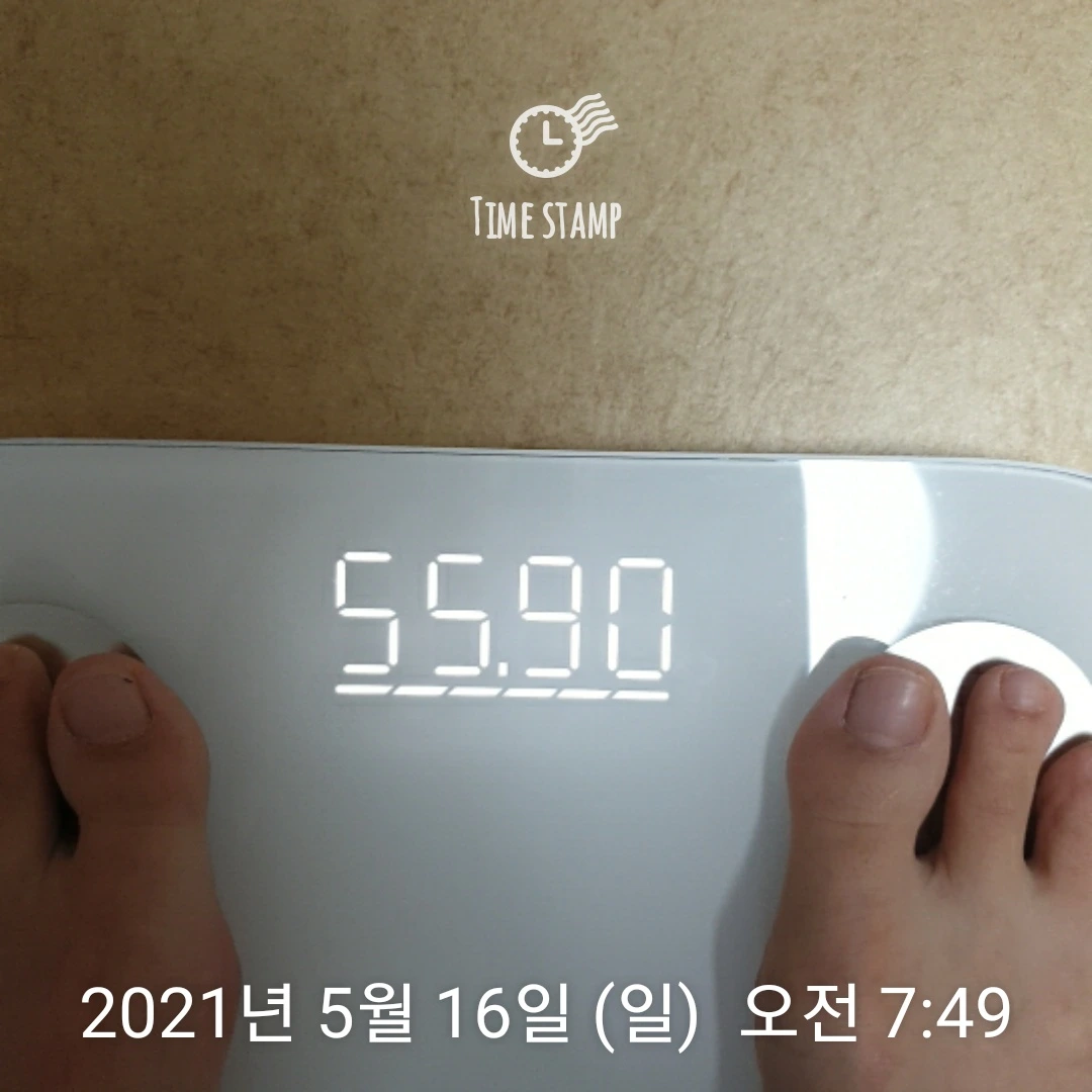 마음을 비우고 아기랑 잠시 놀아주다가 화장실에 한 번 가고서 다시 체중계에 올라가니 56.0kg이 나왔다. 지금이다!!!! 혹시 그거 해보셨는지... 체중계 위에서 발가락에 힘을 주고 이렇게 저렇게 움직이다 보면 0.1kg 정도 적게 나올 때가 있다. 구질구질하지만 살기 위해서 그 짓을 했다. 그렇게 천신만고 끝에 55라는 숫자를 마주했다(이건 다이어트가 아니라 코미디인 듯). 문을 벌컥 열고 남편에게 외쳤다.