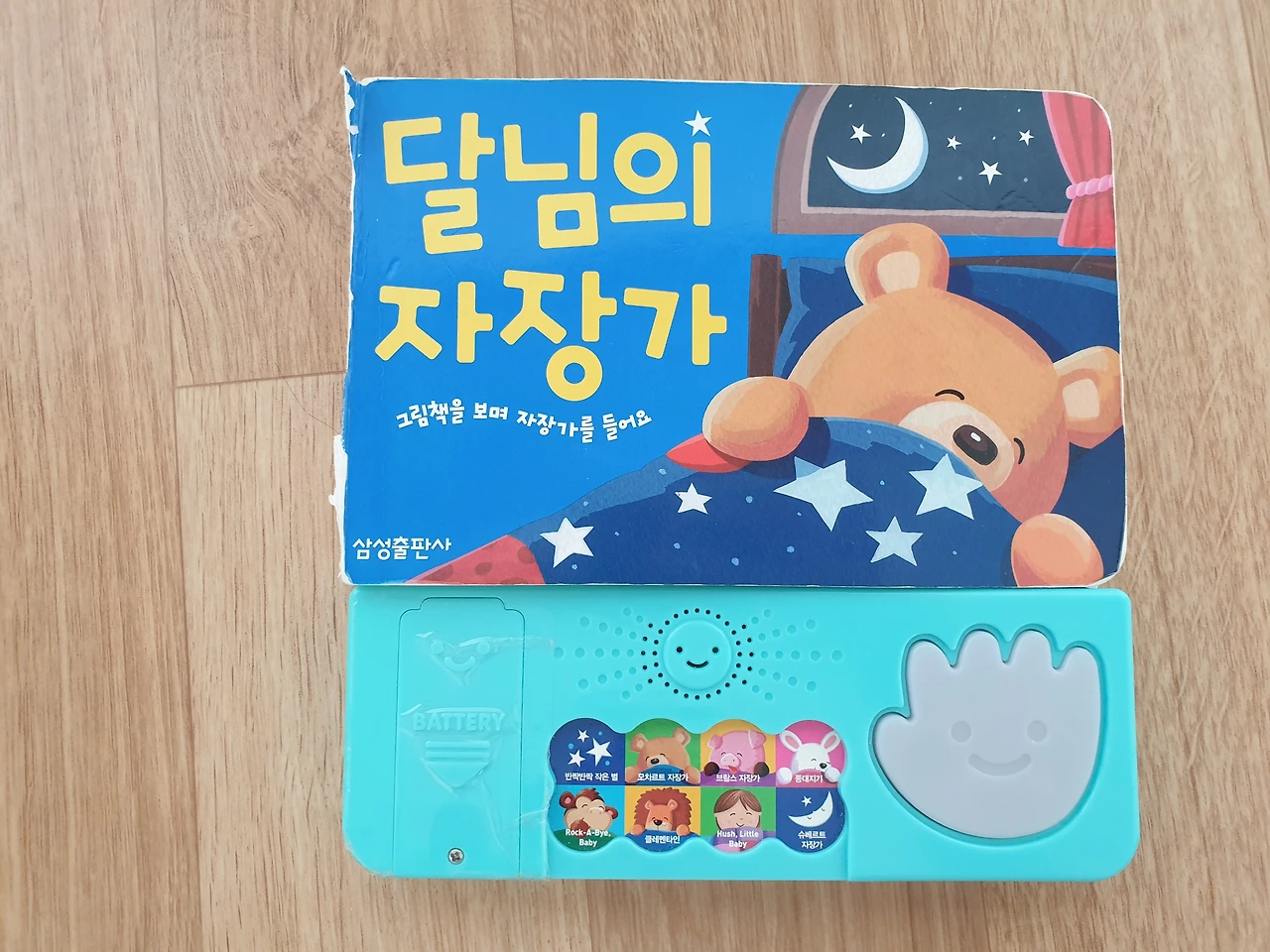 <아기의 털실 공>은 손잡이를 돌리면 캐럴이 나오고, <달님의 자장가>는 버튼을 누르면 다양한 자장가를 들을 수 있다. <달님의 자장가>는 예전부터 자기 전에 종종 읽어주던 책이라 지금은 너덜너덜해졌다(이 책 덕분에 "안녕"과 "잘 자"를 배웠다). 악기 소리가 나는 책도 한 권 있는데 그 책에는 별로 관심이 없는 걸 보면 소리가 난다고 다 좋아하는 건 아닌 것 같다.
