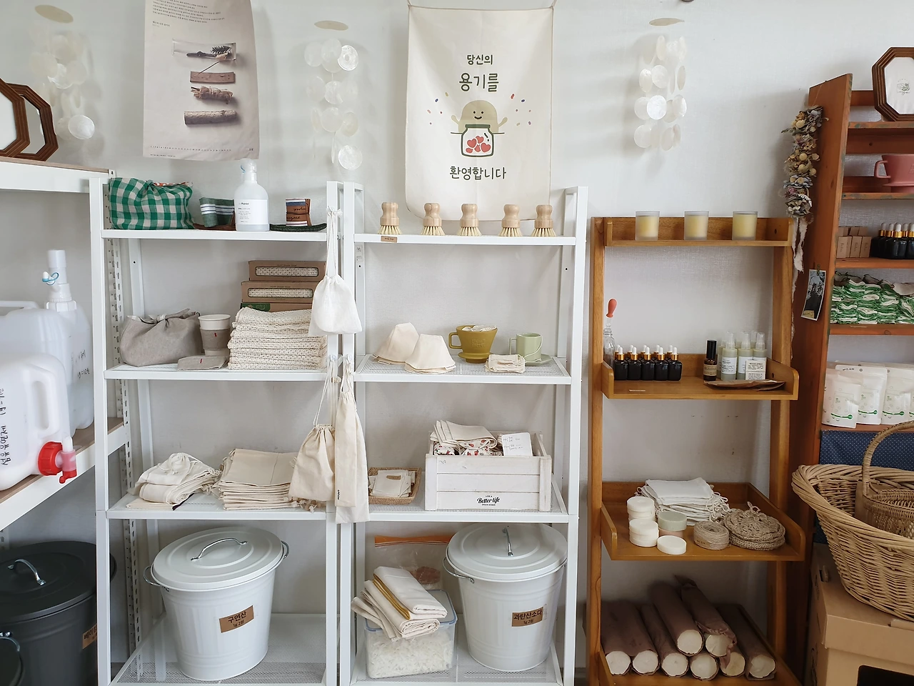 매장은 아파트 단지 안에 있는 상가 3층에 있었다. 간판이 보이지 않아 이곳이 맞는지 한참을 두리번거렸는데 자세히 보니 천으로 붙여 놓은 간판이 있었다. 제로웨이스트샵 간판답다.