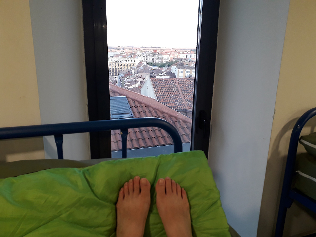 부르고스 공립 알베르게에서 지친 발을 쉬는 중.