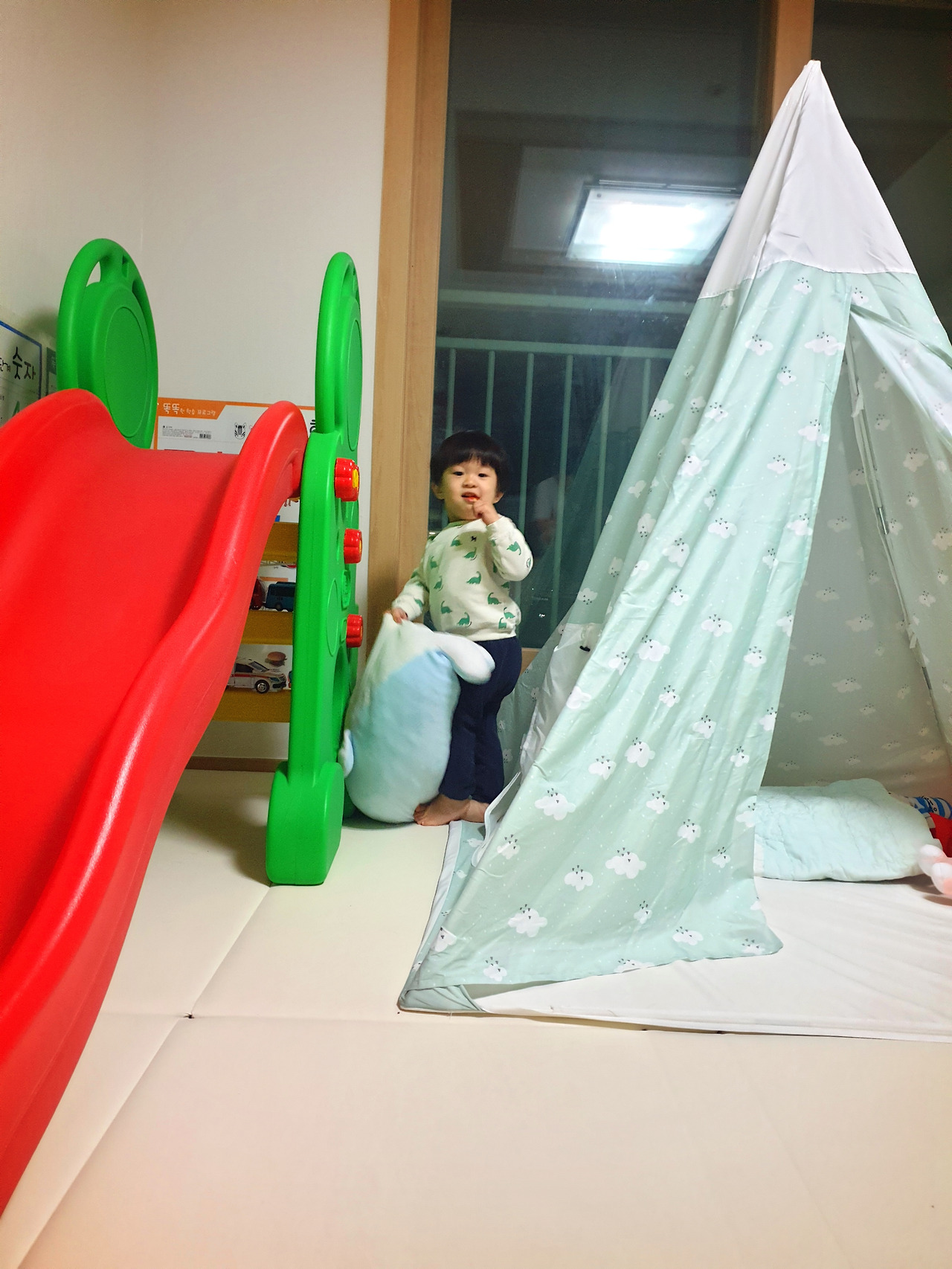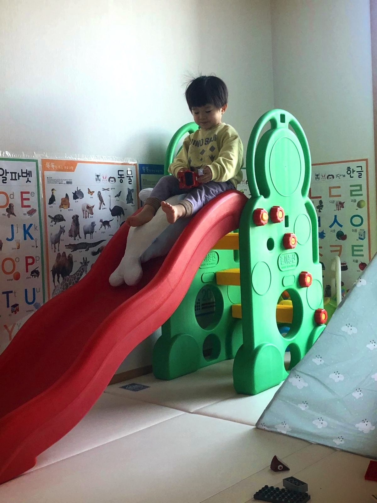 내가 화장실에 있을 때 남편의 목소리가 들렸다. 나는 씻으려고 벗어뒀던 옷을 다시 입고 밖으로 나갔다. 호야는 미끄럼틀 위에 서 있었고... 그 이상의 자세한 묘사는 생략하지만, 아무튼 그 모든 광경을 실시간으로 지켜본 남편은 화를 내야 할지 울어야 할지 망설이듯이 돌처럼 굳어있었다. 결국 출근하기도 빠듯한 그 시간에 우리는 매트 위에 찰랑찰랑 고여 있는 쉬야를 치우고, 미끄럼틀도 분해해서 샤워기로 씻어내는 등 한바탕 거사를 치렀다. 그날 이후로 미끄럼틀은 거실에서 자취를 감췄다. 베란다에서 차마 들여놓지 못하고 있다.