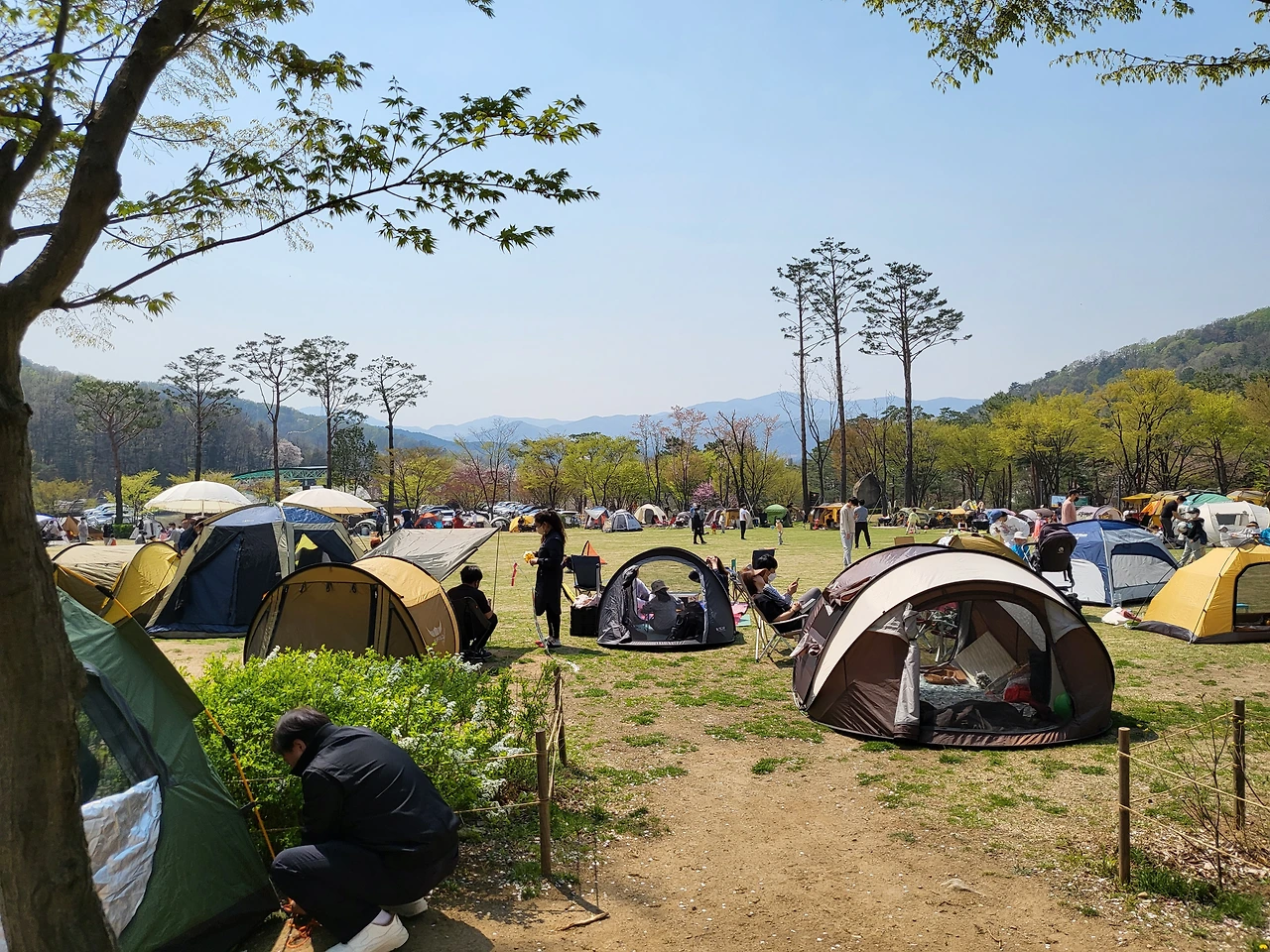 날씨 좋은 봄날 주말에 우리 가족은 당일치기 캠핑을 위해 용인자연휴양림으로 갔다. 새로 구입한 웨건에 호야랑 짐을 올리고. 낮 12시쯤 도착한 잔디광장에는 이미 텐트가 쫙 깔려 있었다. 아이와 공차기를 하며 노는 사람, 연날리기를 하는 사람, 비눗방울 놀이를 하는 사람들로 가득했다.
