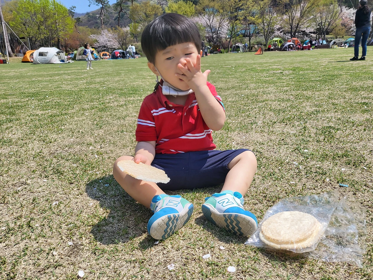 우리도 한쪽에 텐트를 쳤다. 그리고 호야랑 열심히 놀았다. 공놀이도 하고 비눗방울 놀이도 하면서. 호야는 특히 큰 비눗방울을 만들어주면 그걸 쫓아가 터뜨리는 데 즐거움을 느꼈다. 누군가가 항상 비눗방울을 만들고 있어서 잔디광장 위에는 비눗방울이 쉴 새 없이 흘러 다녔다. 아직 지지 않고 남아있는 벚꽃도 가끔씩 꽃비를 내려줘 우리가 있는 풍경을 더 아름답게 했다.