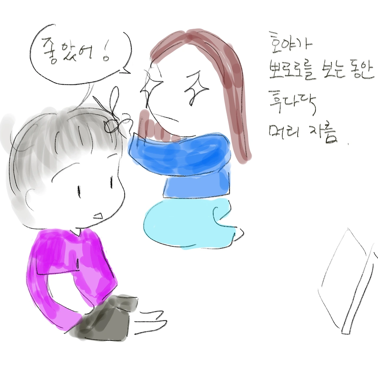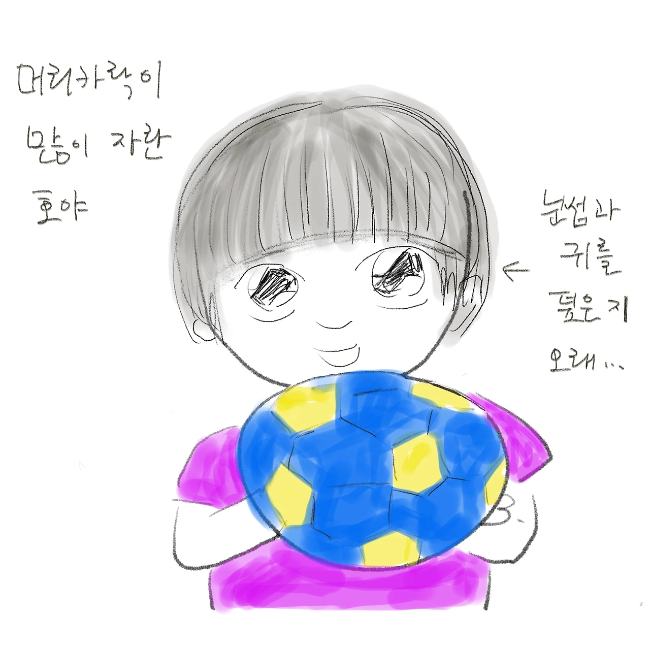 뽀로로를 틀어놓고 호야가 넋을 놓고 보는 사이 아기 손톱 가위(매번 아기 손톱 가위로 머리를 잘랐더니 그게 습관이 됐다)로 이발 시작! 아기 얼굴에 머리카락이 안 묻도록 A4용지를 앞머리 밑에 받치는 등 부산스럽게 머리를 잘랐다. 급한 앞머리만 자르려고 했는데 자르다 보니 옆머리, 뒷머리까지 손이 가서 앞으로 두 달 간은 미용실을 안 가도 될 것 같았다.