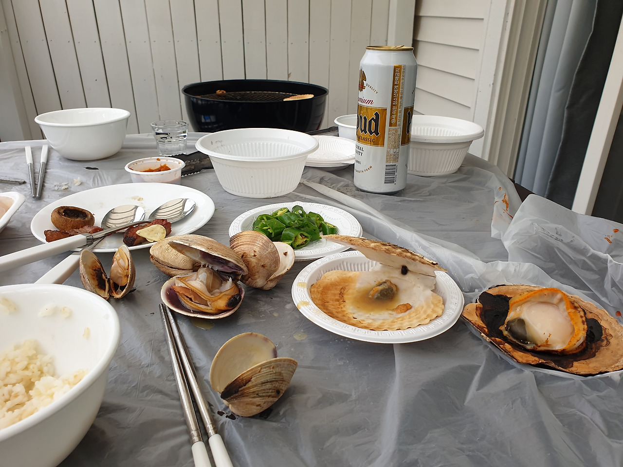 남편은 삼겹살과 조개를 구워줬고, 나는 아기를 한 팔로 안고 남편이 구워주는 것들을 열심히 주워 먹었다. 바비큐를 너무 오랜만에 먹어서인지 진한 감동이 밀려왔다.