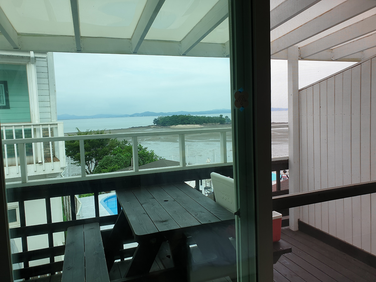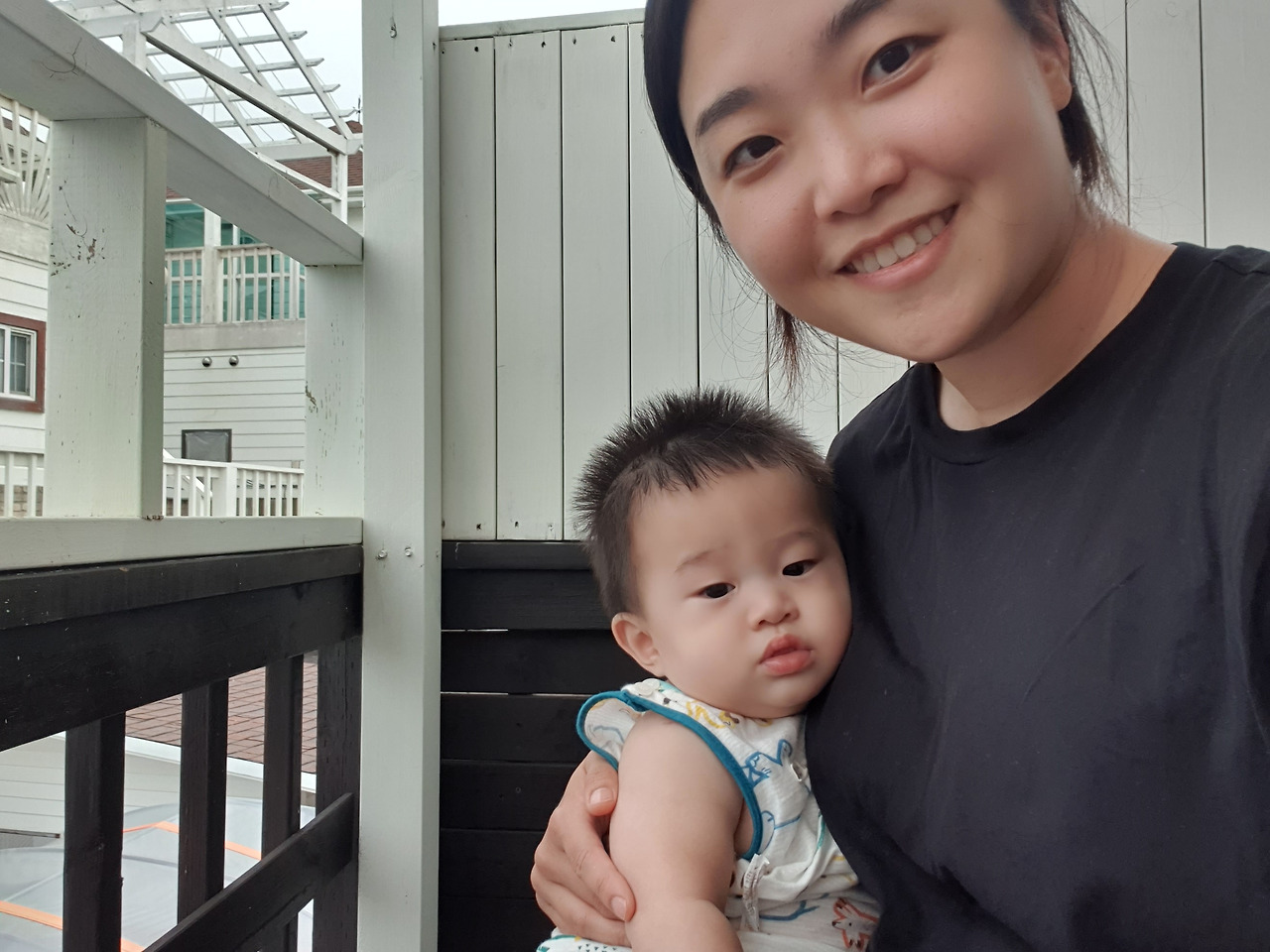 아기를 안고 테라스에 나가 바다를 보여줬다.