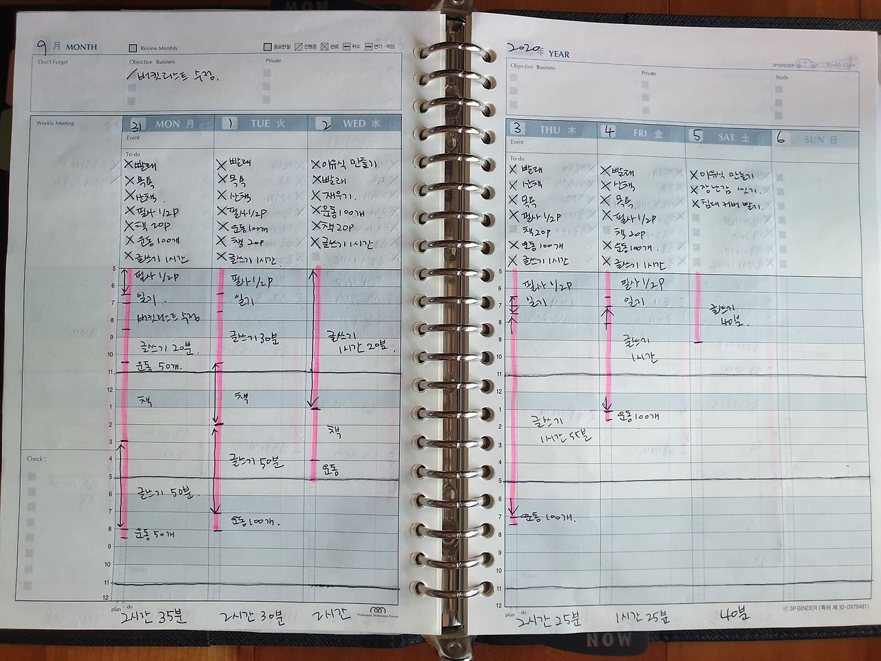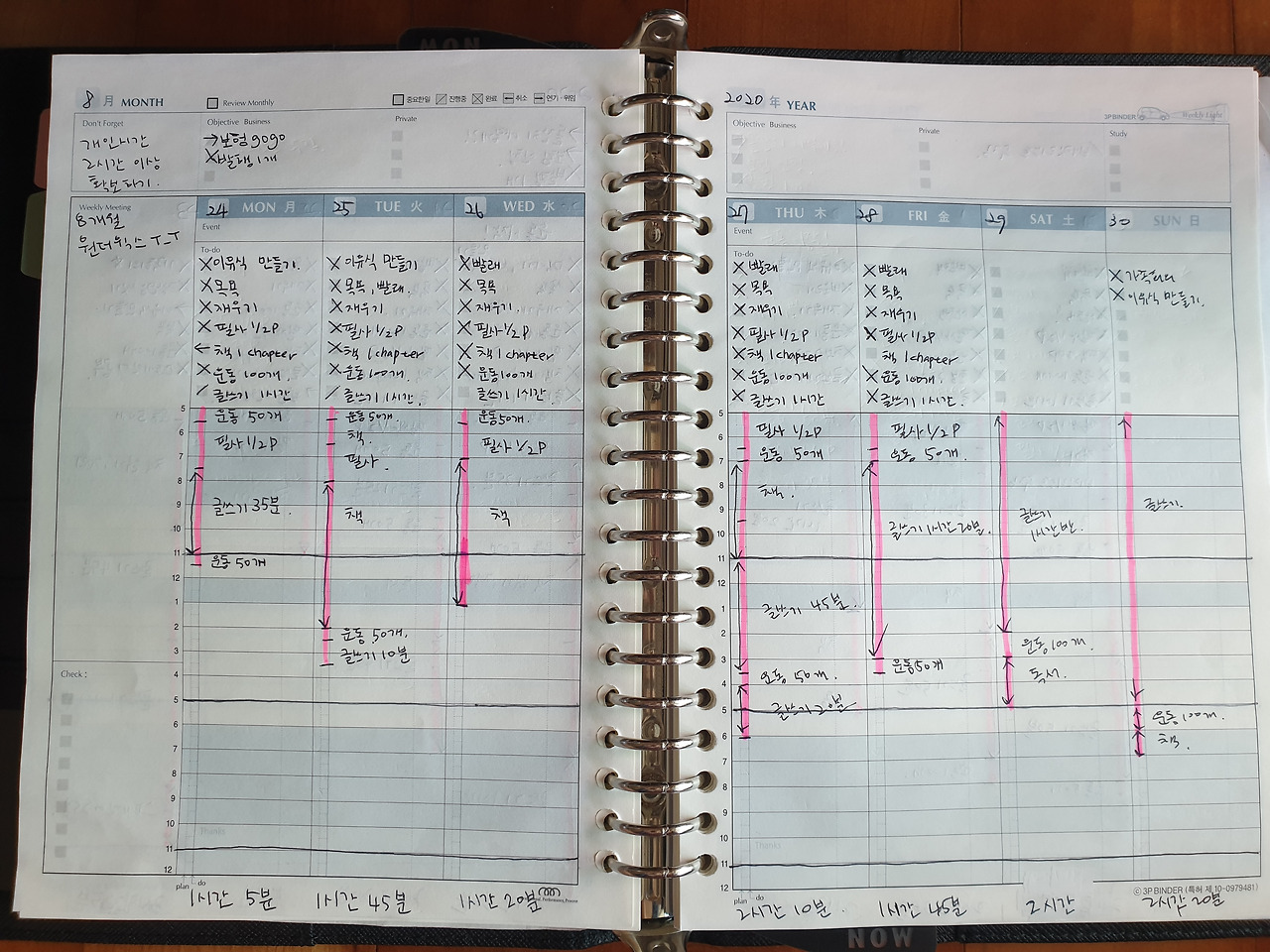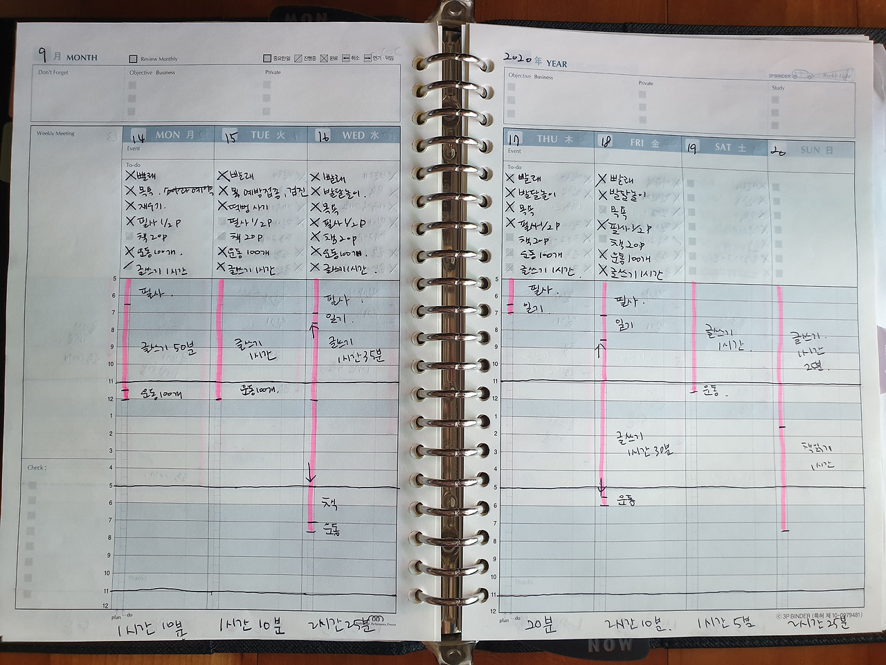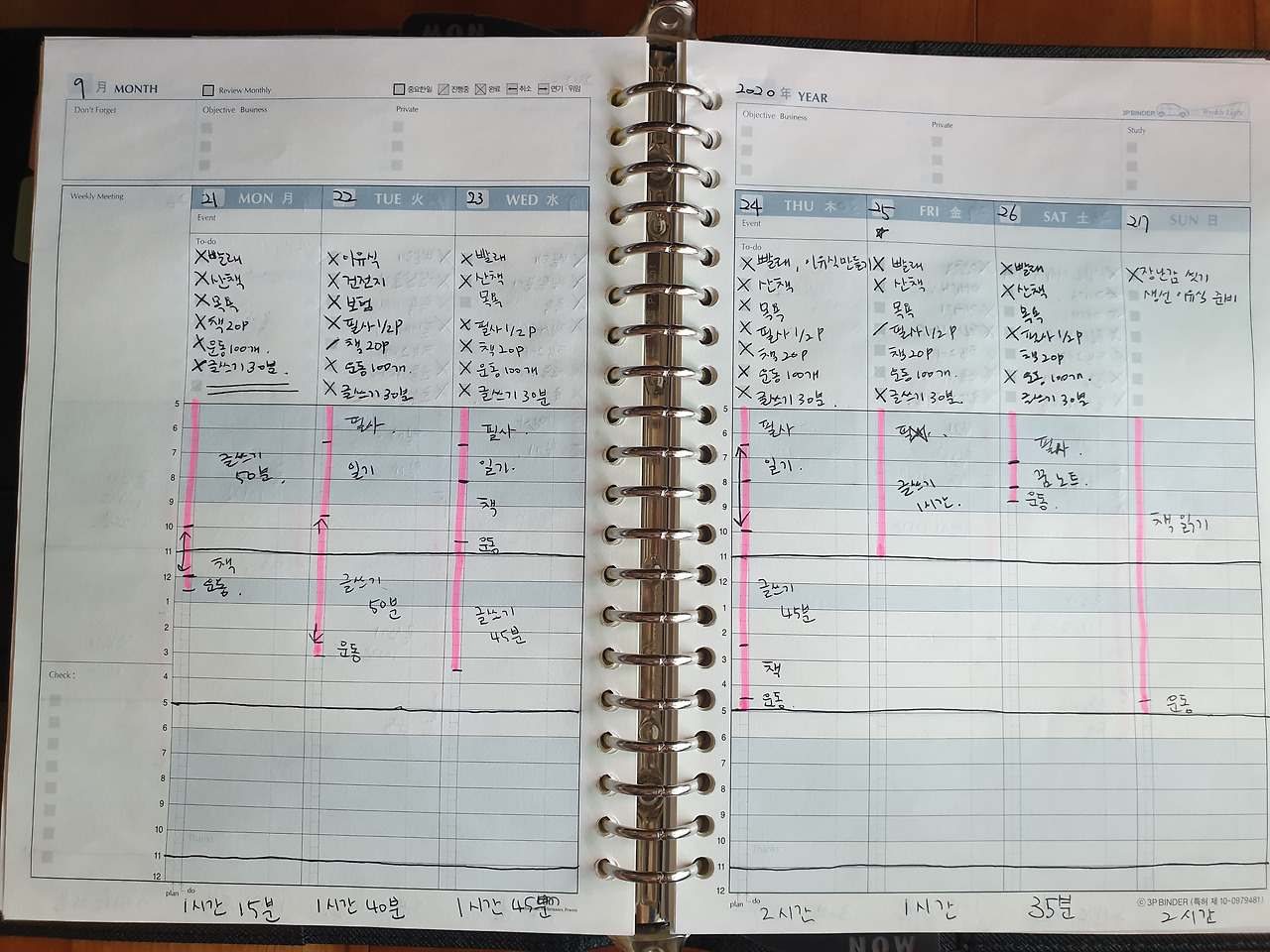 1. 매일 (그날의 여유 시간이 생기자마자) 다이어리를 펼쳐서 오늘 내가 하고 싶은 일들의 목록을 적는다.