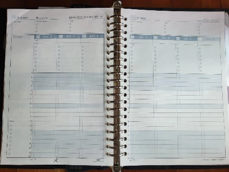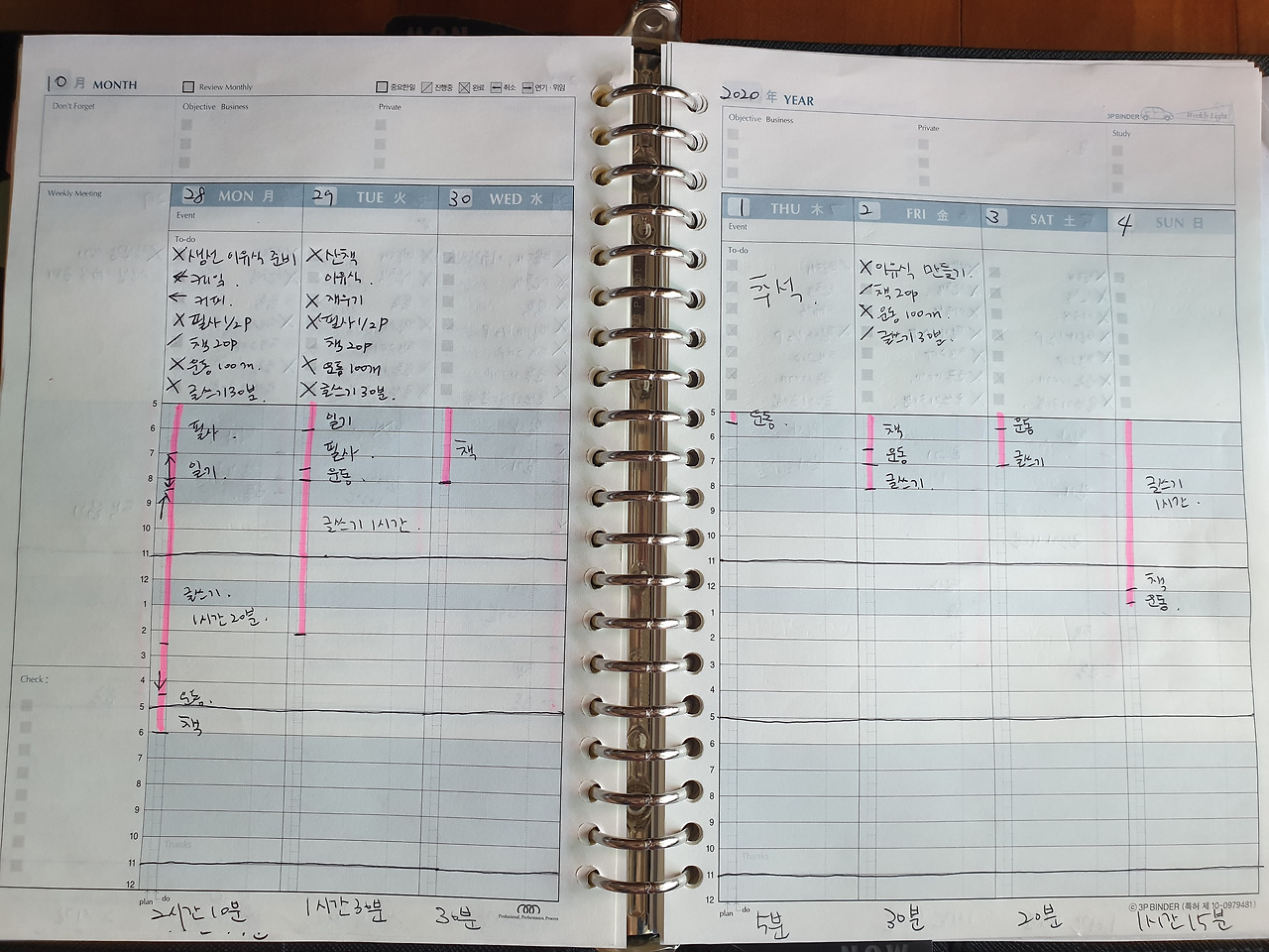 to-do 리스트 밑에 시간 계획표에는, (적혀있는 시간을 무시하고) 위에서부터 한 칸을 10분으로 계산해서 기록했다. 시간을 미리 계획하는 게 아니라 리스트에 적힌 일을 하는 데 보낸 시간을 나중에 표시했다. 스톱워치에 30분이 찍혔다면 3칸을 채웠다.