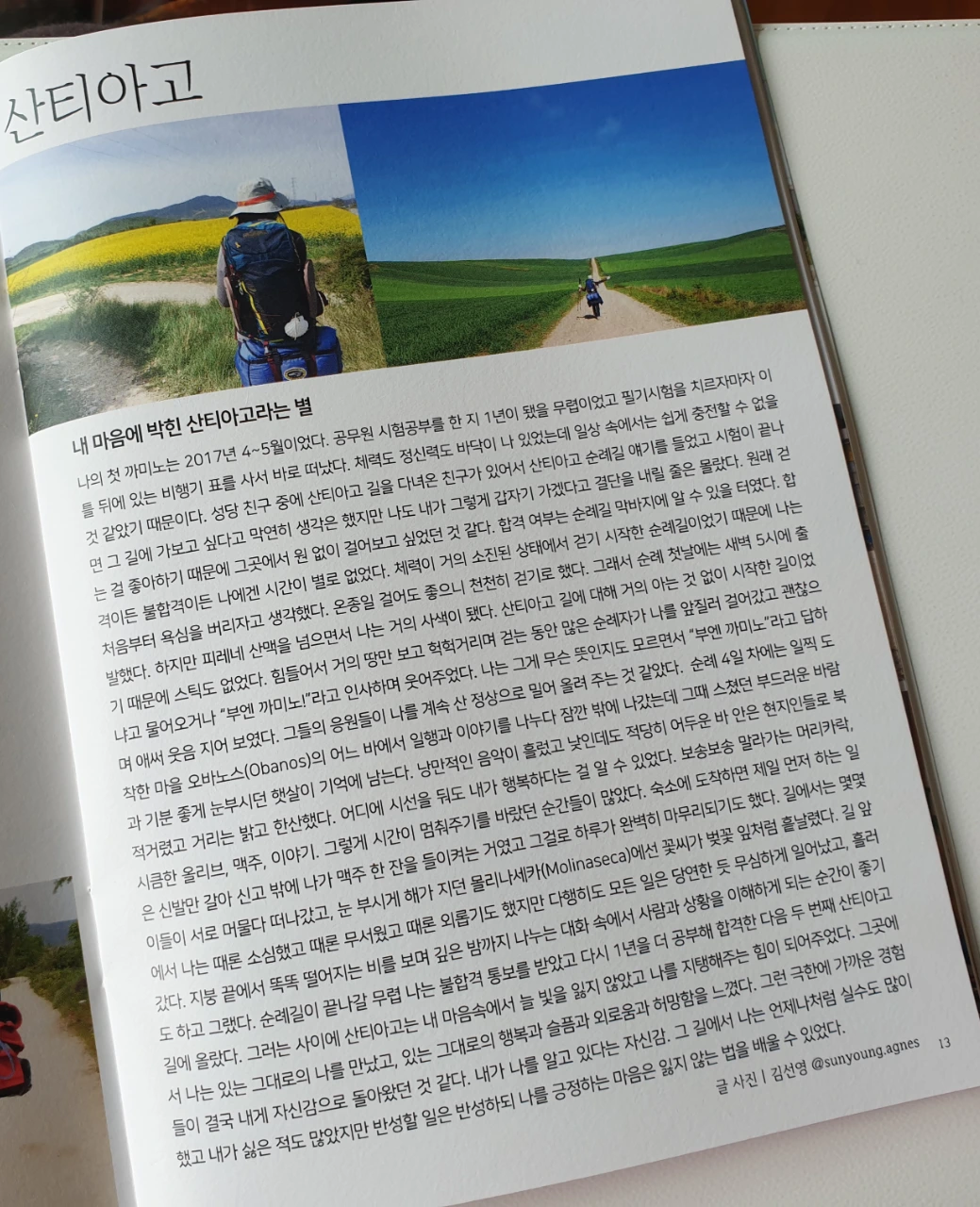 전에 메모해놨던 글을 찾아 수정 작업을 했다. A4 용지 한 페이지가 안 되는 짧은 글을 쓰는 데 며칠이 걸렸다. 아기가 4개월일 때라 짬을 내기가 쉽지 않았는데 바쁜 일정을 비집고 잠깐씩이나마 내가 좋아하는 일을 할 수 있다는 데에 즐거움을 느꼈다. 산티아고를 떠올리는 것도, 글을 쓰는 것도 설렜다. 4월 말에 메일로 보낸 원고는 8월호에 실렸다.