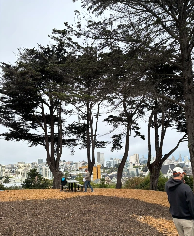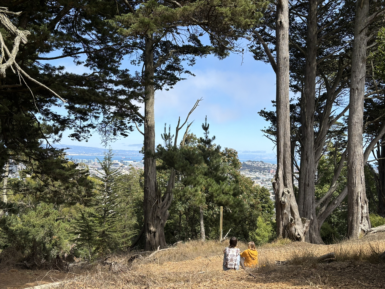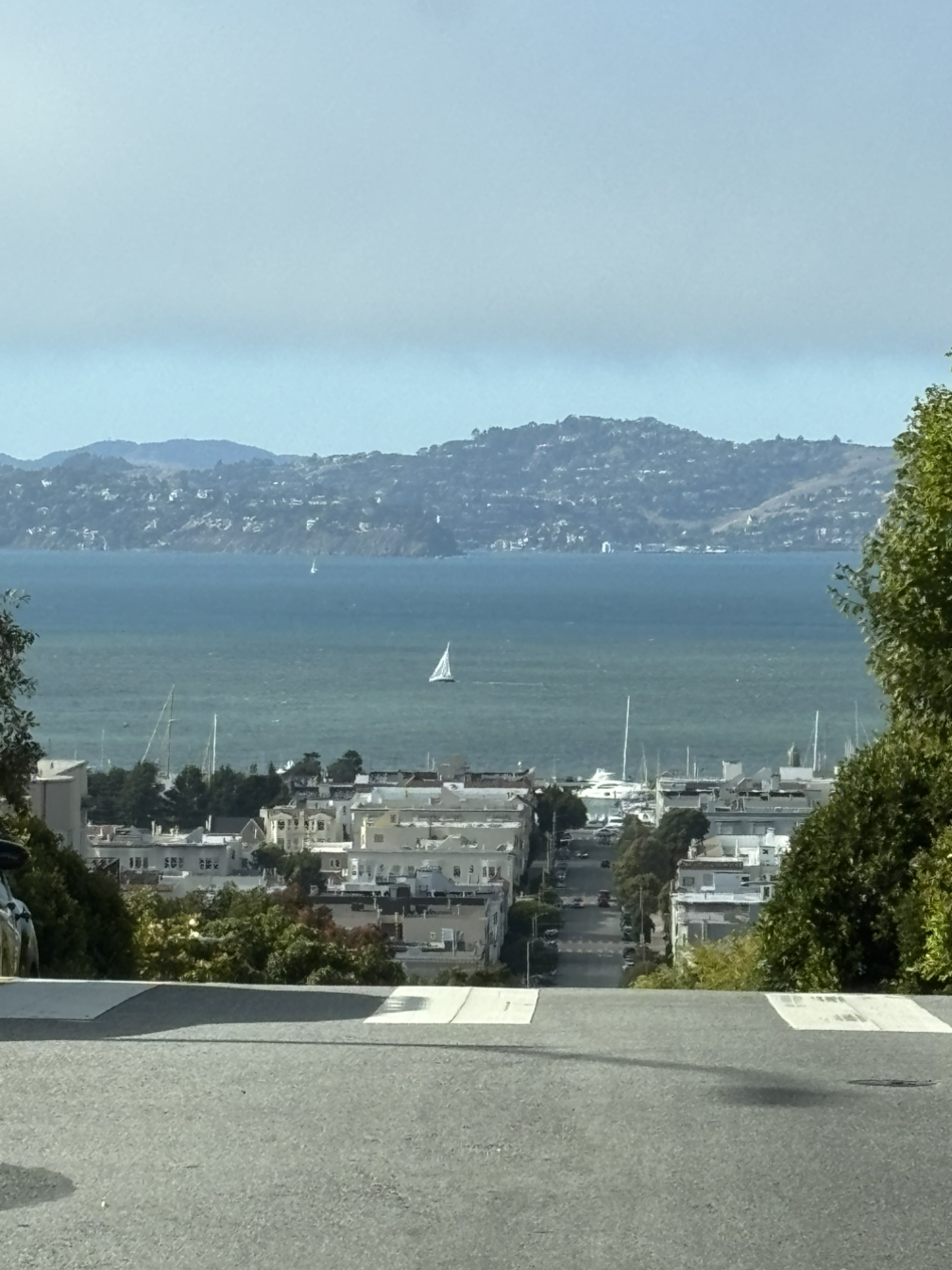 사방으로 쫙쫙 뻗은 거리들, 다닥다닥 붙은 집들, 다운타운의 높은 건물들, 샌프란시스코 베이가 보이고, 주변을 둘러싼 나무들이 보인다. 걸어 내려오는데, 어떤 아저씨가 한숨 늘어지게 낮잠을 자고 있다. 바로 곁에 4마리 개들이 아저씨를 지키고 있었다. 아무래도 홈리스 같았는데, 아저씨를 떠나지 않는 개들이 신기했다.