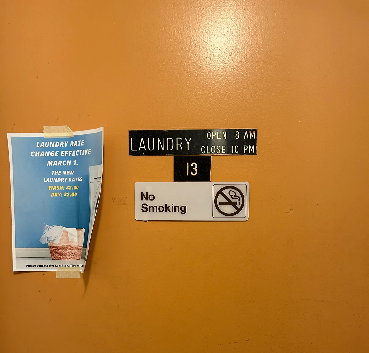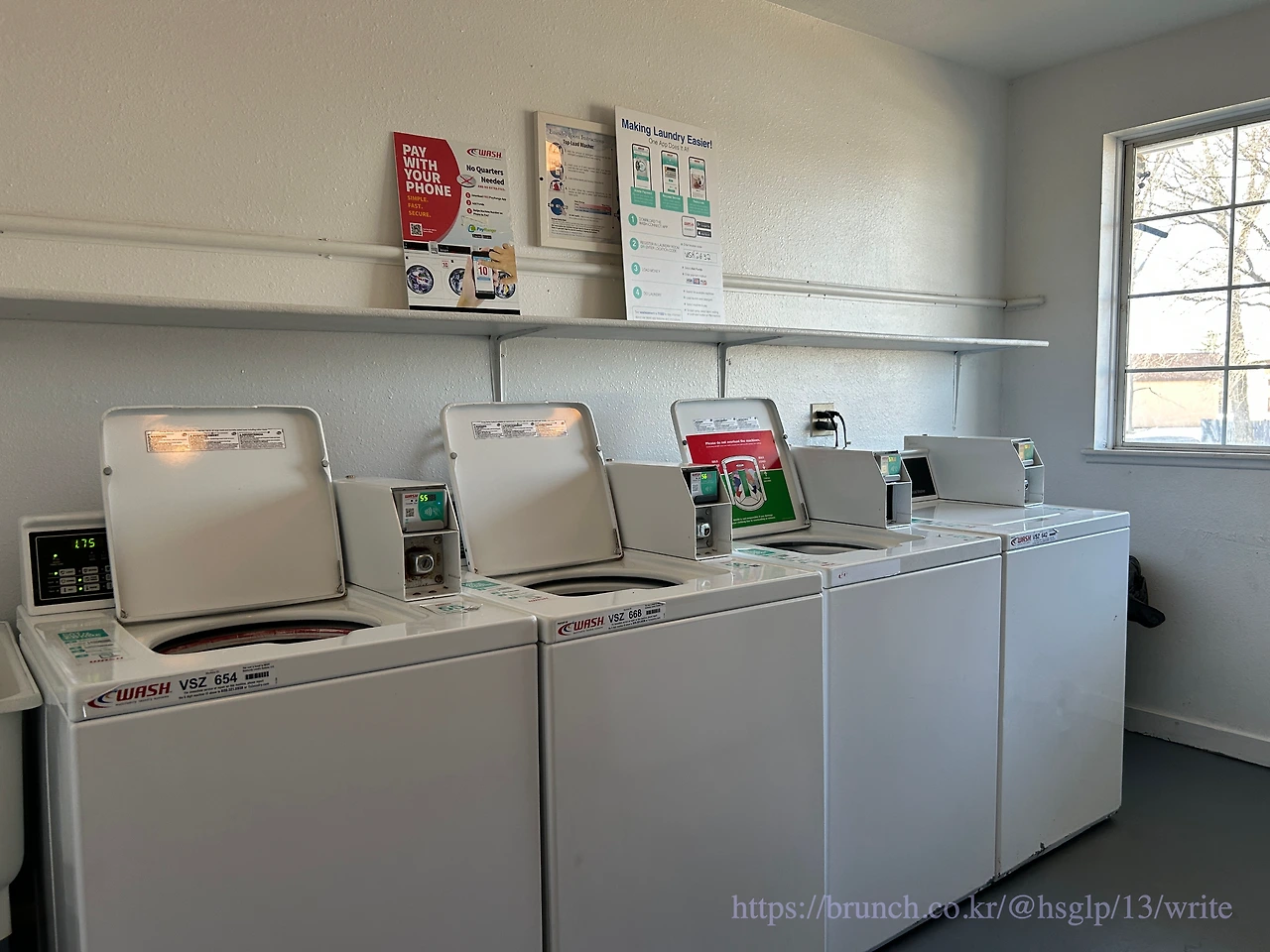우리 아파트는 빌딩 두 동마다 빨래방이 하나 있다. 미국 아파트는 일부를 제외하면 대부분 3층 정도 높이다. 우리 아파트는 한 층에 4 가구가 사는 것이 일반적인데, 두 동마다 하나씩 빨래방이 있다는 것은 24 가구가 하나의 빨래방을 공유한다고 이해할 수 있다. 다만, 세탁기와 건조기가 각각 4대뿐이라는 게 함정이다.