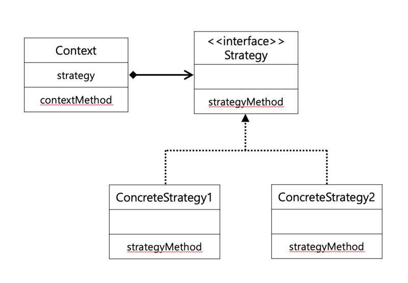 Context는 전략을 선택하고 실행하는 역할을 합니다. 선택한 전략을 실행하려면 전략을 소유하고 있어야 합니다. 그래서 앞에서 배웠던 것과 같이 갖고 있음을 표현하기 위해 마름모(◇)가 있는 화살표를 사용했습니다.