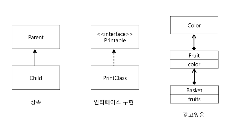 갖고 있음: 집약(aggregation)이라고 표현되는데, 갖고 있음으로 표현하는 게 더 직관적이라서 그렇게 적어봤습니다. Basket 안에는 Fruit가 있습니다. Basket은 Fruit를 갖고 있습니다.