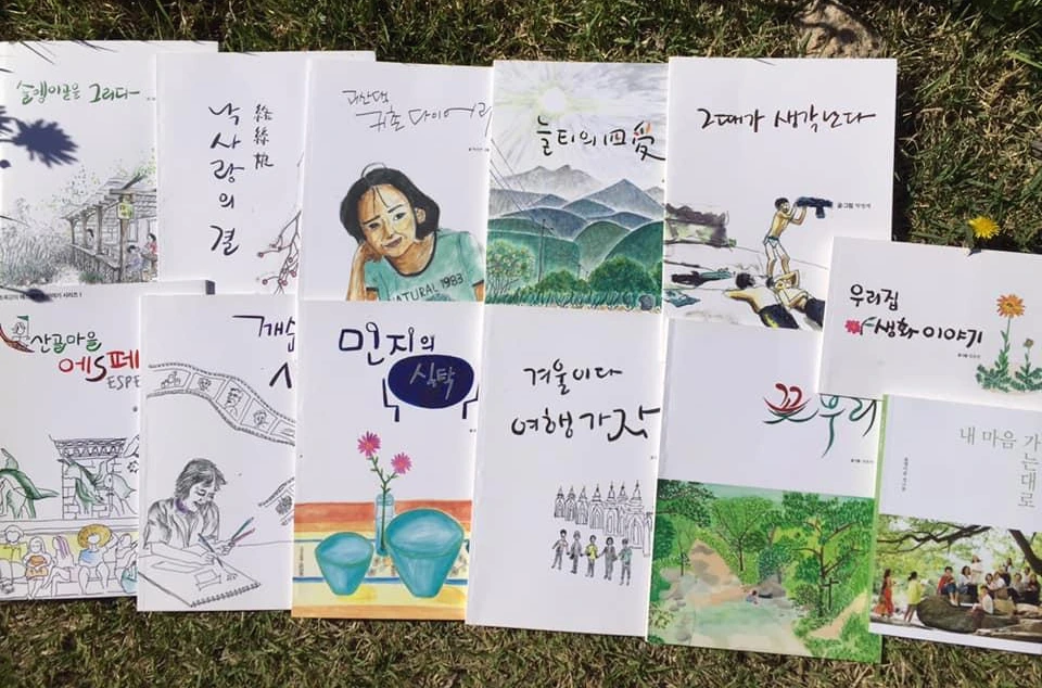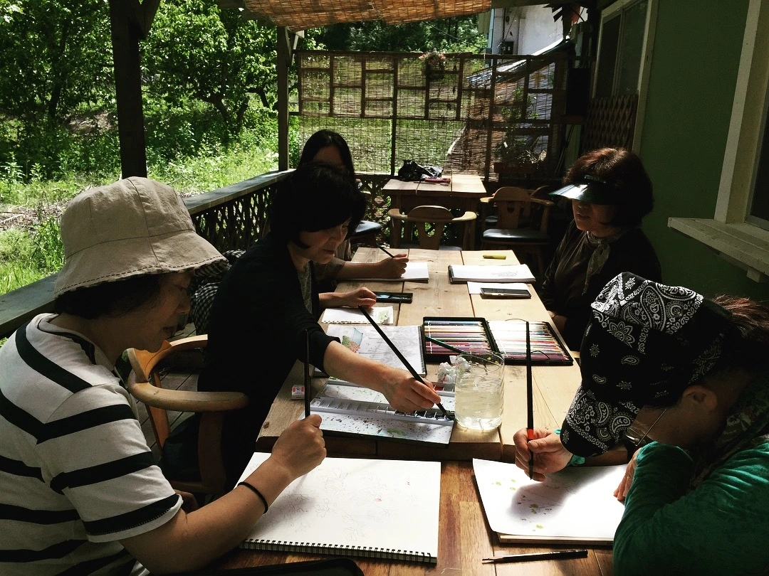 시간이 지날수록 사람들은 각자 자기만의 멋진 그림을 하나둘 그려냈다. 같은 재료로 요리를 해도 음식 맛은 천차만별이듯 누군가의 손에 쥐어진 붓이냐에 따라 터치와 색감도, 바라보는 시선과 주제도 각양각색이었다. 붓을 든 이의 생각과 삶의 태도가 고스란히 그림 속에 담겨있었다. 매주 새로운 그림을 만나는 기쁨은 컸다. 세상에 단 하나밖에 없는 개성 있는 그림들, 각자 그 속에서 자신의 과거를 돌아보고, 상상의 나래를 펴기도 했다가 오래 묻어두었던 꿈과 만나기도 했다. 기꺼이 들려준 내밀한 이야기를 가장 먼저 만날 수 있어서 행복한 시간이었다. 벚꽃 필 때 시작한 수업은 여름을 지나 나뭇잎이 우수수 떨어질 때쯤 마무리되었다. 이제 한 달간 책을 만들어내는 일만 남았다. 사람들이 건네준 글과 그림을 정리해 손으로 넘겨볼 수 있는 책이라는 형태를 만들어내야 했다. 이웃 마을에 사는 젊은 디자이너와 협의하며 인디자인과 인쇄의 세계를 처음 경험했고, 발 동동 거리며 홀로 애태우던 인고의 시간을 거쳐 드디어 솔멩이골 주민 열한 명의 그림책이 탄생했다. 이 책들이 나오기까지의 전 관정을 다룬 내 책을 비롯해 야생화 그림책, 귀촌 그림일기, 열두 살 때부터 쉰 살까지 쓴 일기를 엮은 책, 요리 그림책, 가족 여행 그림책 등 글도 그림도 개성이 넘쳤다.