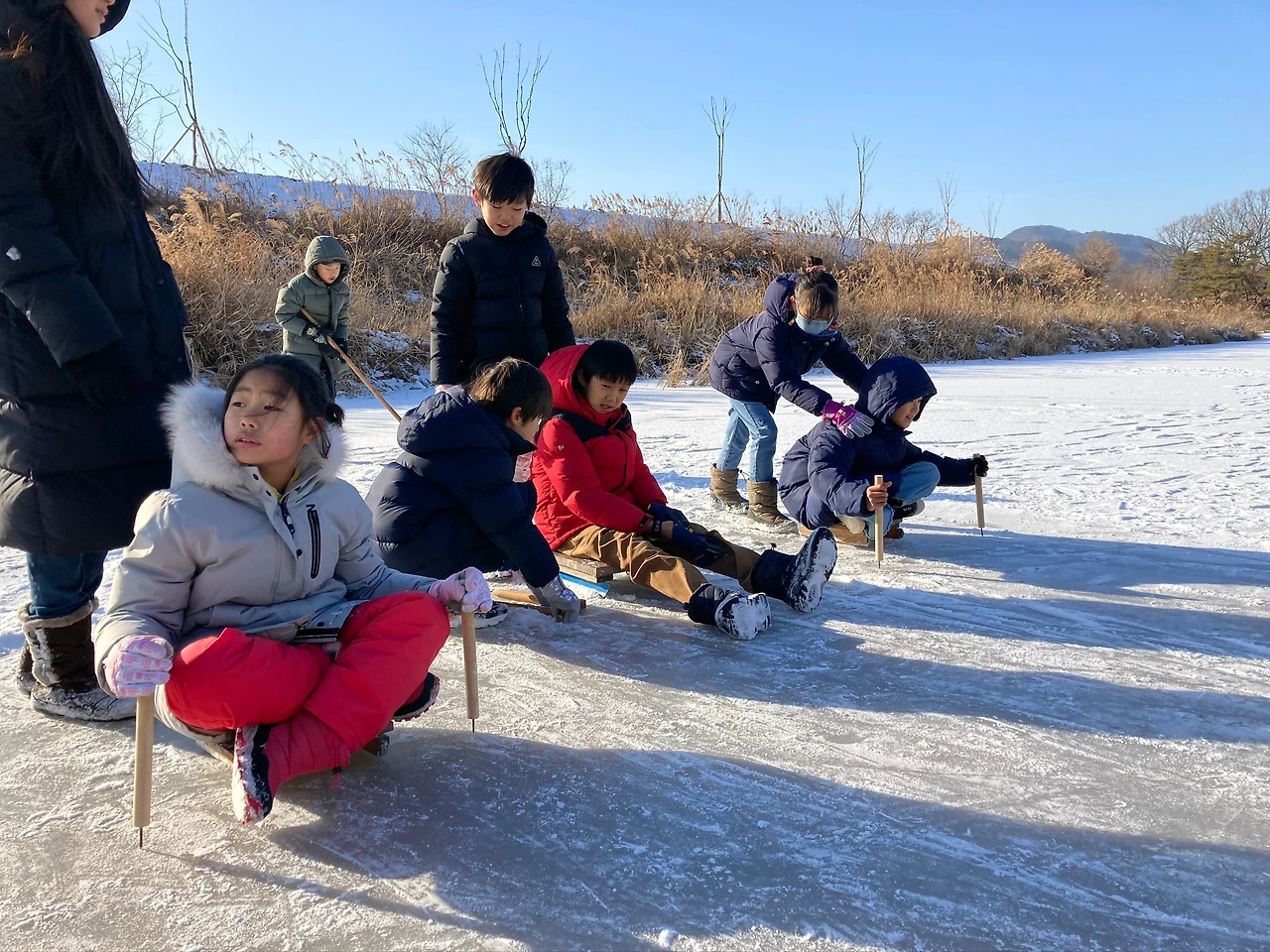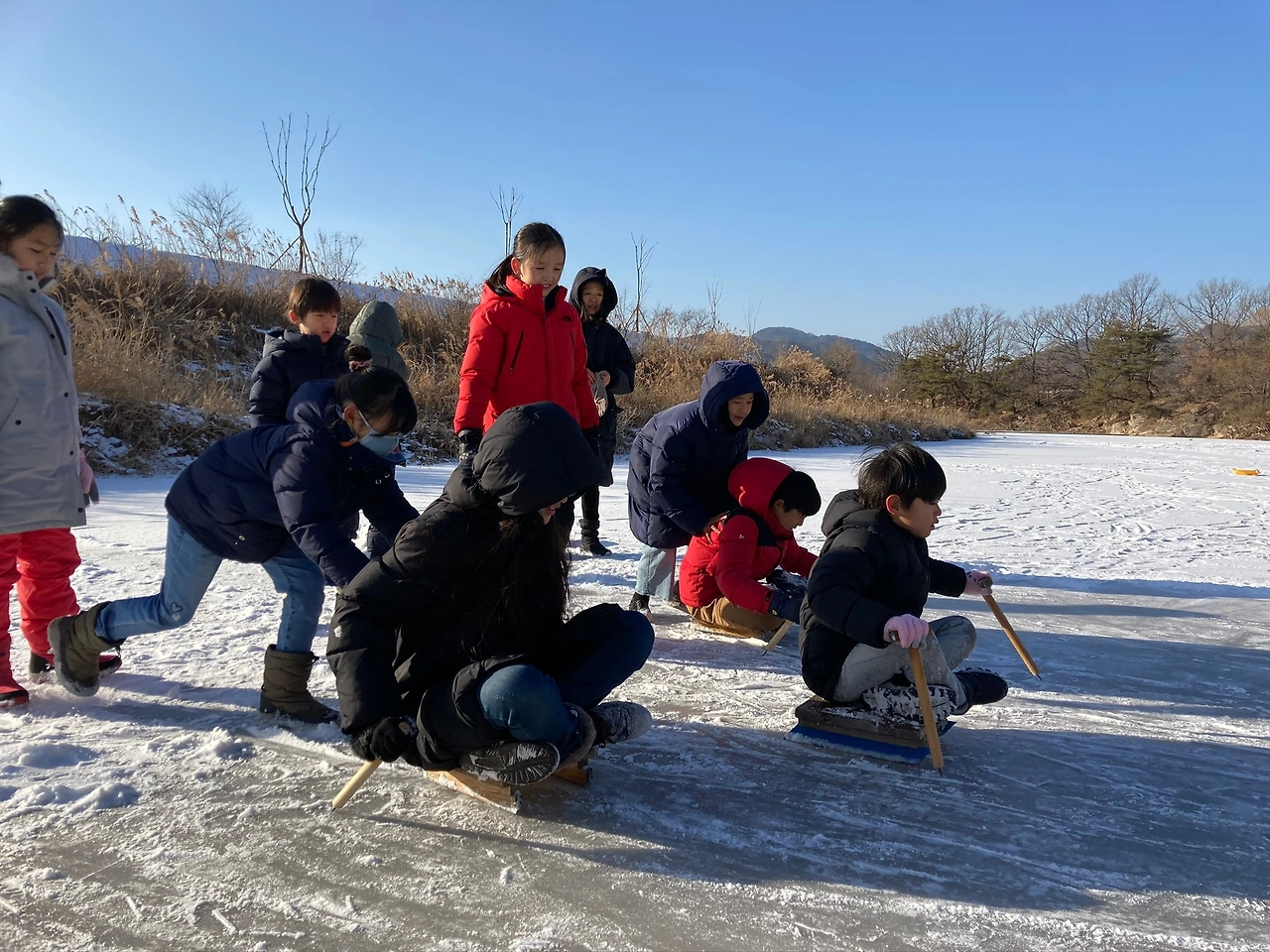 모두가 챙겨 온 형형색색 플라스틱 썰매는 내려놓고 다들 나무 썰매 타는 재미에 푹 빠졌다. 나무판에 썰매 날을 달아 정목수가 만들어준 썰매다. 얼음판에 꼬챙이를 힘차게 내리꽂은 다음, 온몸에 힘을 빼야 앞으로 나갈 수 있다. 제자리에서 낑낑 대는 아이, 스스로 타는 법을 터득해 신나게 나아가는 아이, 가다가 자빠져서 빙판에 제 몸을 떼구루루 굴리며 노는 아이. 저마다 제 방식대로 썰매를 탄다.