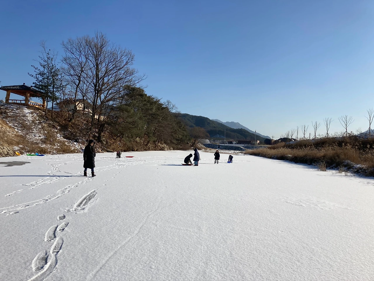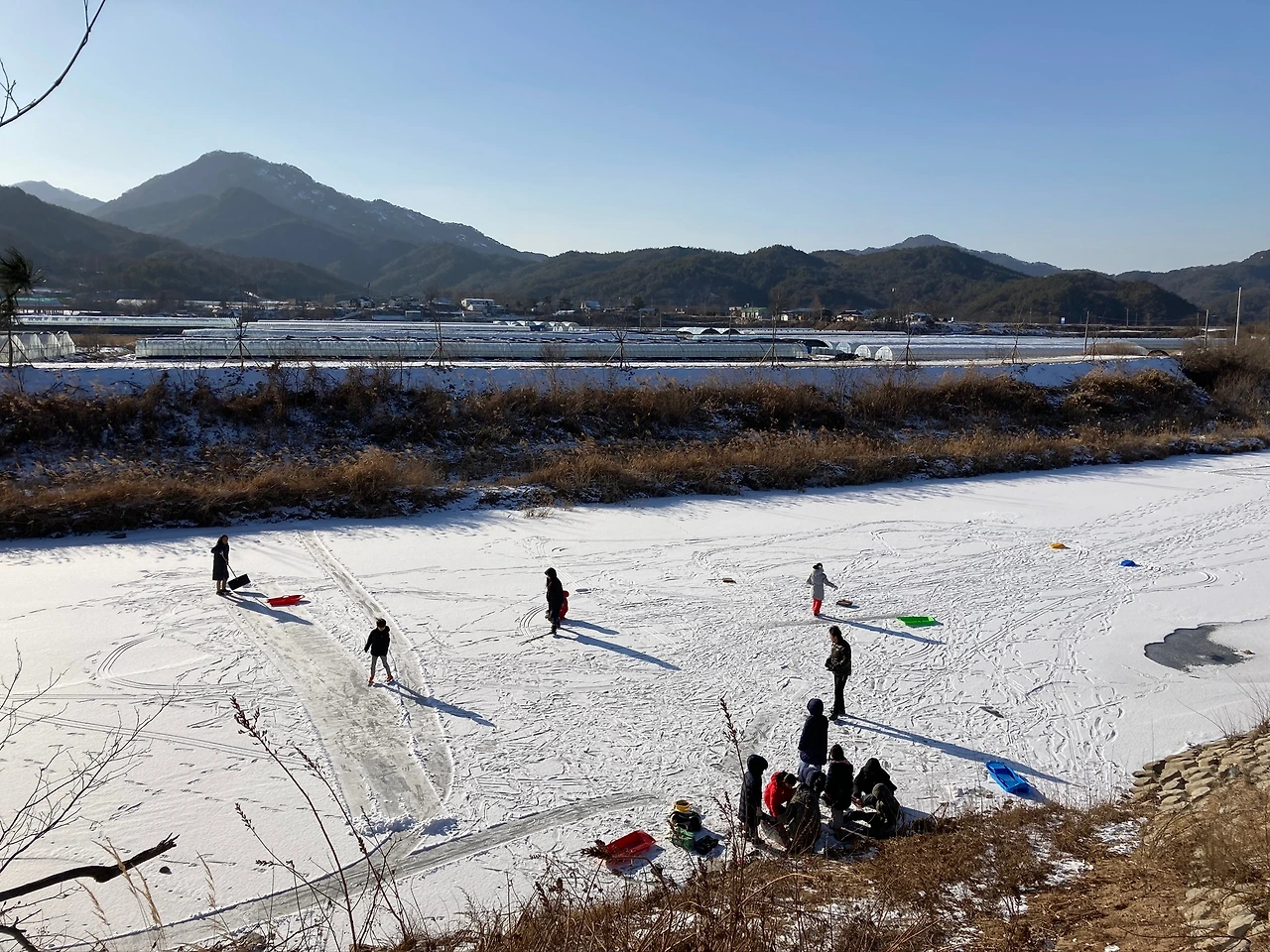 기상관측 이래 가장 따뜻한 겨울로 기록된 지난겨울. 눈도 얼음도 구경하기 어려웠다. 올 겨울엔 함박눈이 내리고 강추위가 이어지며 강물이 얼었다.마을을 가로질러 굽이굽이 흐르는 화양천도 꽁꽁 얼었다. 여름에는 물장구치고 겨울이면 썰매 타며 뒹구는 솔멩이골 아이들의 놀이터.