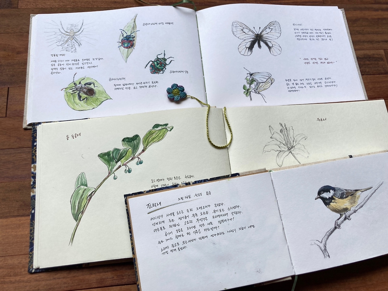 어느 순간부터 나의 산책은 그들의 존재를 발견하고 변화를 관찰하는 것이 목적이 되었다. 식물과 곤충, 나무와 열매를 찾고 그 주변에 존재하는 작디작은 세계를 찾아 헤맨다. 바라보는 것에서 한 발 나아가 내 호기심을 자극하는 자연물을 채집해 집안으로 들이기 시작했다. 도감을 찾아 통성명을 하고 그림으로 기록한다. 내 책상은 자연이 불러들인 채집물과 온갖 색상의 색연필과 연필들, 다양한 펜과 수채화도구로 늘 엉망이다. 야생의 동식물을 수렵채집하던 옛사람의 DNA가 내 안에 살아있음을, 그들과 연결되어 있음을 강하게 느끼는 순간이기도 하다.