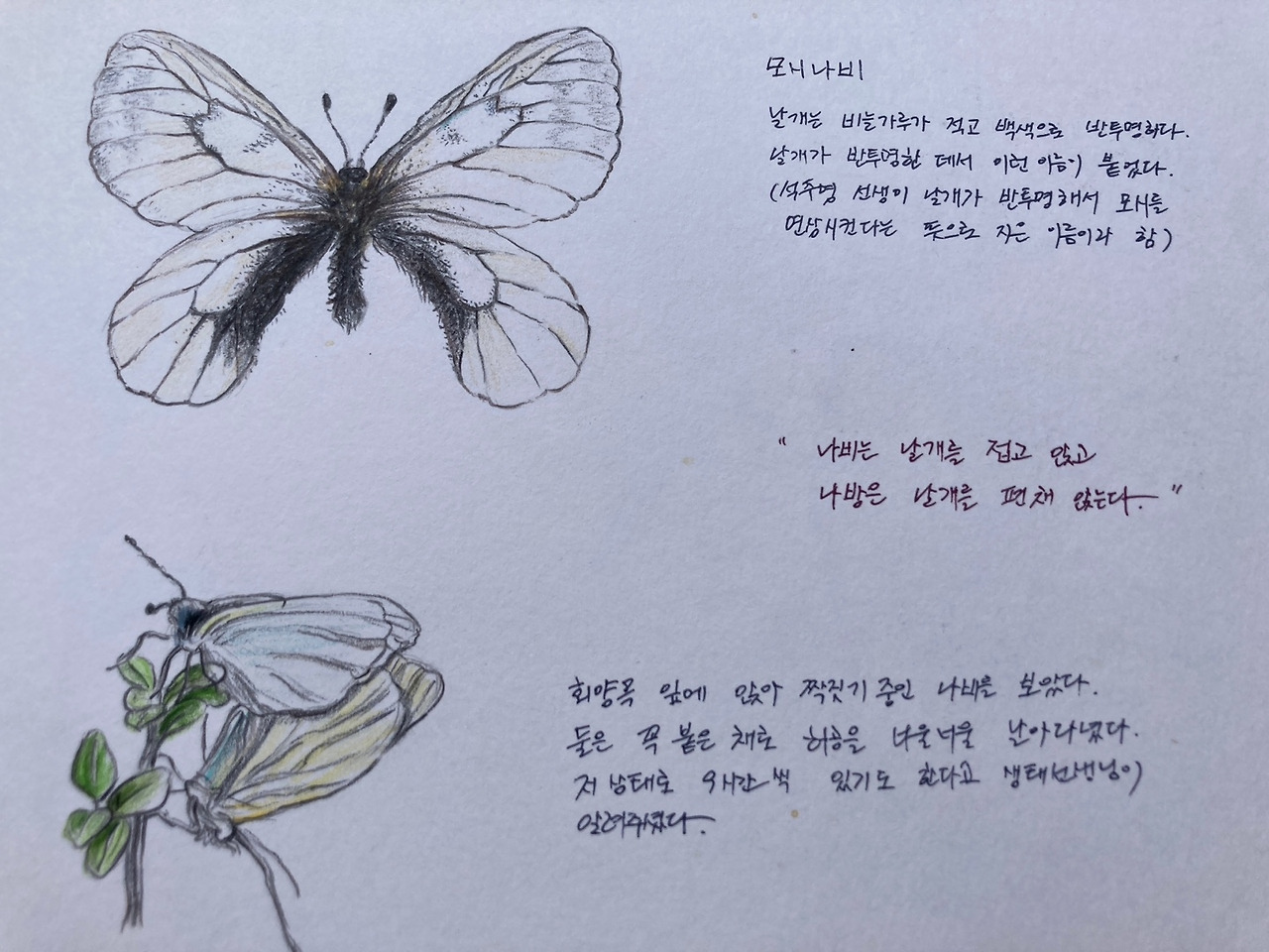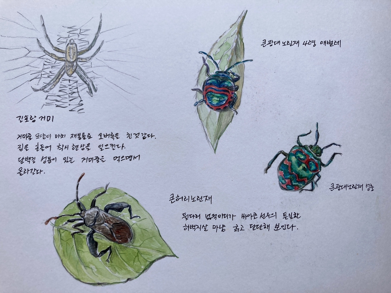 지난여름, 무성한 관목숲에서 발견한 곤충을 보며 전율했던 기억이 떠오른다. 왕사마귀, 긴 호랑거미, 큰 허리노린재, 짝짓기 중인 모시나비 한쌍. 덤불숲은 수많은 곤충의 얽히고설킨 서식지였다. 내 심장은 지금껏 한 번도 느껴보지 못한 묘한 감동으로 약동했다. 내가 이 작은 생명들과 함께 지구에 살고 있다는 현실감이 온몸으로 전해지는 순간이었다.