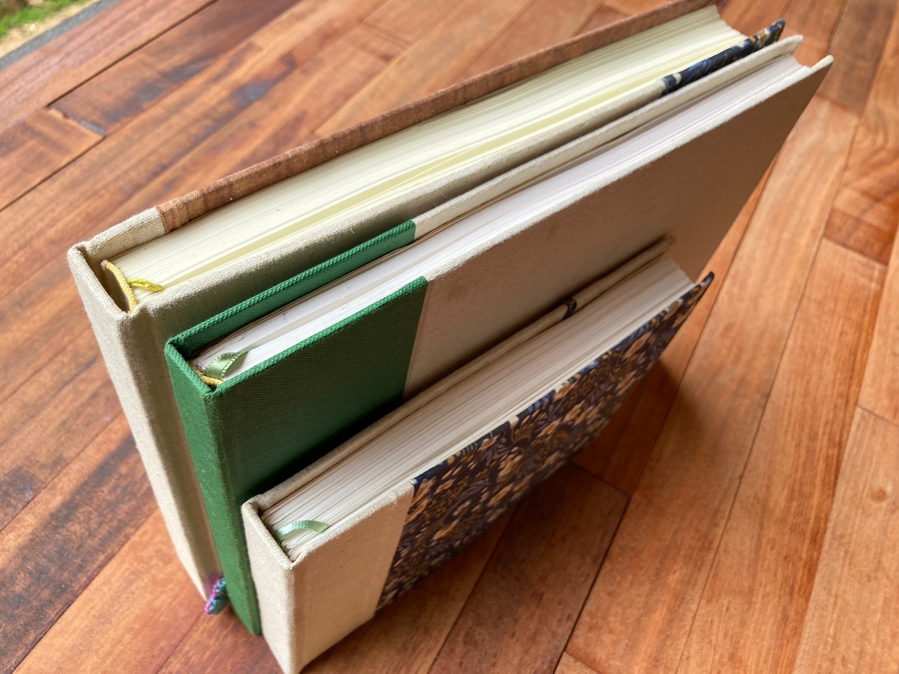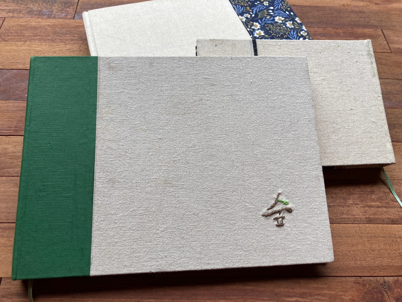내가 만난 작은 세계를 소중하게 보관하고 싶었다. 도화지를 잘라 실과 바늘로 엮어서 책이라는 집을 만들었다. 커튼으로 썼던 리넨천을 잘라 하드커버 표지를 감싸고 "숲"이라는 글자로 수를 놓았다.