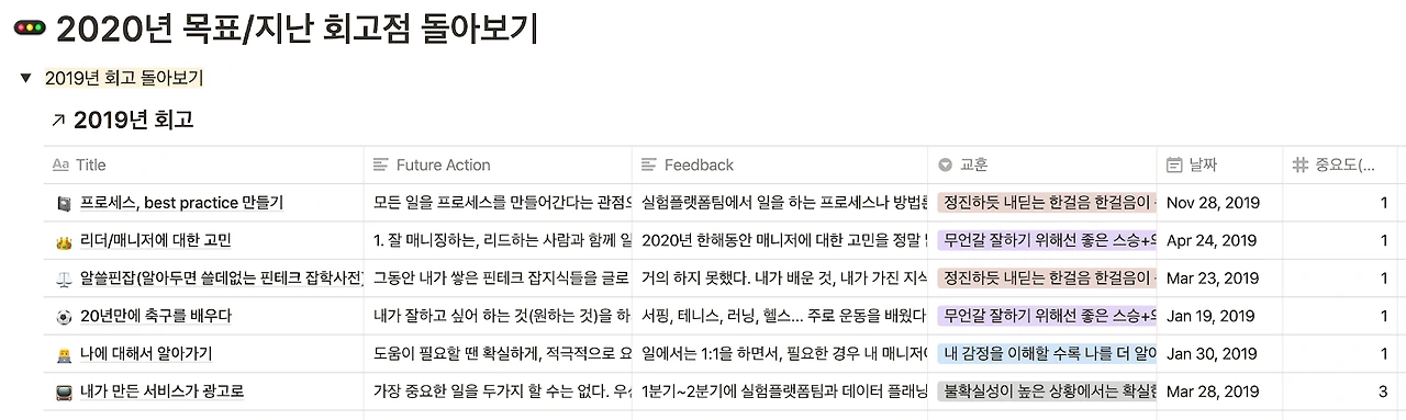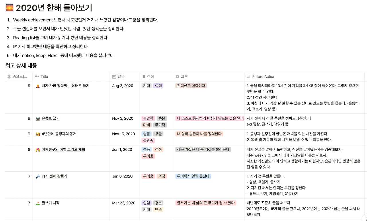 그다음으로는 2020년의 계획을 살펴보고, 회고 방법에 따라 내가 한 해 동안 마주했던 주요 사건과 검정들을 기록하였다. 다행히 매주 Todolist를 정리하고, 회고해왔던 기록들 덕분에 더 쉽게 2020년 한 해를 돌아볼 수 있었다.