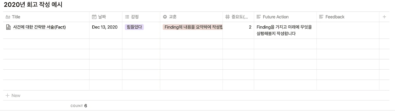 해당 페이지에 아래 회고 작성 표를 복사, 붙여 넣기 한다