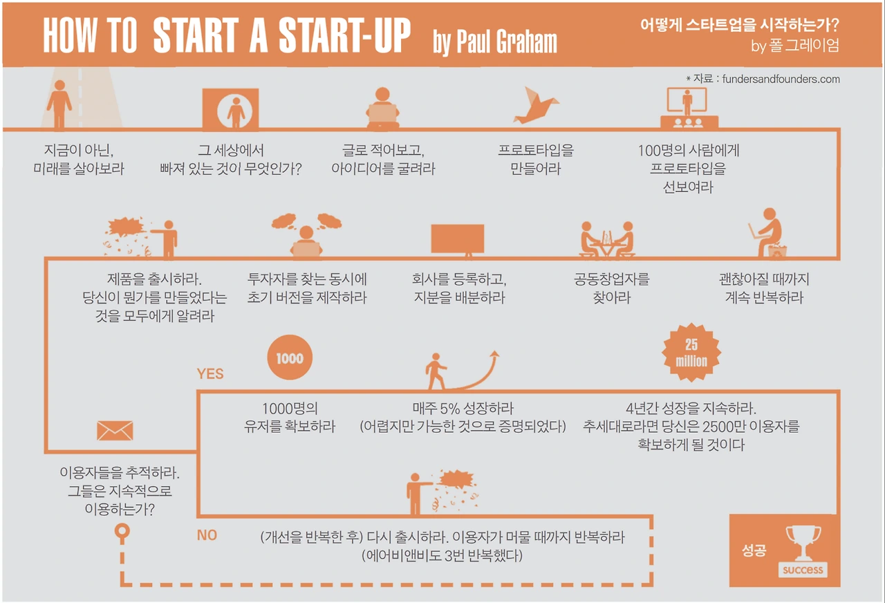 이런 과정을 어디서부터 어떻게 해야 되는지에 대해선 철저하게 Paul Graham의 <어떻게 스타트업을 시작하는가?>를 참고했다. 미래에 예견될 문제들, 꼭 해결되어야 할 문제들을 상상해보고 그런 문제들이 현재는 어떻게 해결되고 있는지 찾아보면서 시니어 시장과 교육시장에 관심을 갖게 되었다.