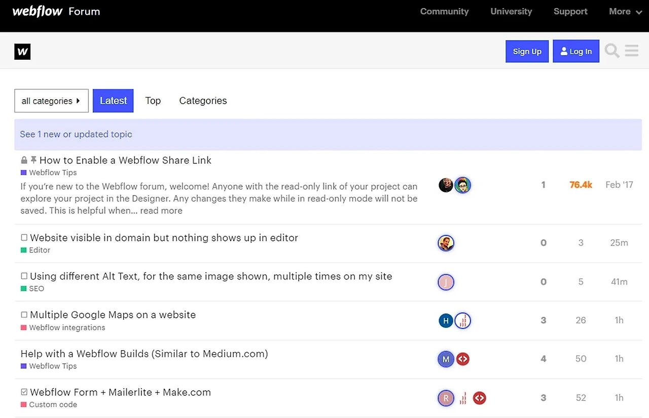 코드 없는 웹사이트 빌더인 Webflow는 훌륭한 사례 연구입니다. 공동 설립자인 브라이언트 추(Bryant Chou)에 따르면 커뮤니티는 회사의 초기 성장에 중요한 축이었지만, 실제로는 마지막 순간에 추가한 기능이라고 합니다. Webflow 팀은 베타 버전을 공개하기 불과 몇 시간 전에 Discourse 계정을 만들었는데, 현재 이 커뮤니티의 회원 수는 75,000명이 넘습니다. Webflow의 잠재 고객은 혼자 일하는 프리랜서이며, 서로 어울리고 서로를 지원하며 Webflow에서 멋진 일을 하는 방법을 자랑할 수 있는 공간을 갈망할 것이라는 통찰력을 얻었습니다.