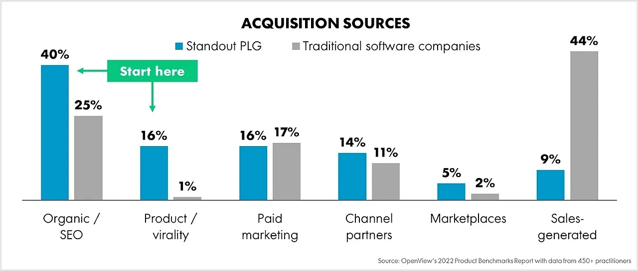 자연 검색과 제품 바이럴은 평균적인 PLG 기업의 신규 사용자 중 56%를 차지합니다. 이러한 채널 중 하나(또는 두 가지 모두)로 시작한 다음 유료 마케팅, 마켓플레이스 리스팅, 채널 파트너 또는 아웃바운드 비즈니스 개발과 같은 채널을 단계적으로 추가하여 노력을 확대하세요.