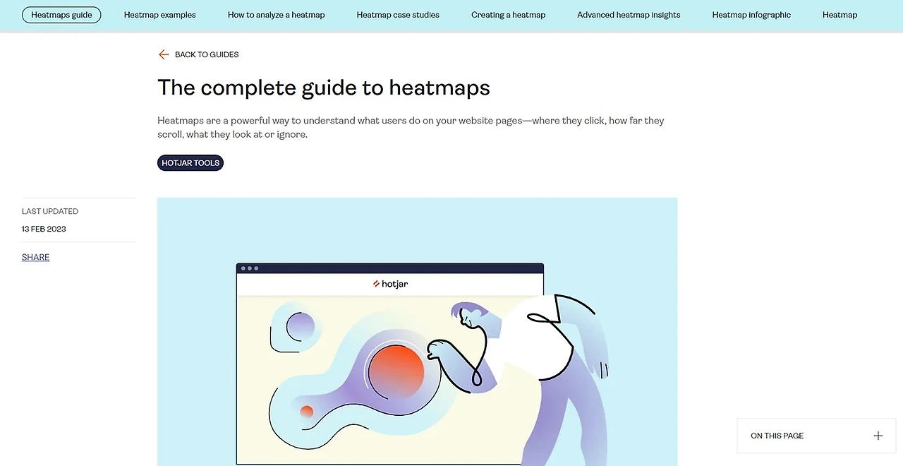 여기에서, 주요 제품, 특히 검색량이 많은 제품을 중심으로 큐레이팅된 허브를 통해 공격적으로 고객들에게 다가가세요. 웹사이트 분석 회사인 Hotjar는 히트맵 및 세션 기록과 같은 기능을 중심으로 한 허브를 통해 이를 매우 효과적으로 수행하고 있습니다. 실제로 이 회사는 "히트맵", "히트맵 도구", "히트맵 가이드"에 대한 자연 검색 결과에서 1위를 차지하고 있습니다.