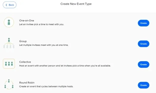 한 가지 분명한 예는 새로운 이벤트 유형을 만드는 것입니다. Calendly는 사용자에게 어떤 유형의 미팅을 주최할 것인지 묻습니다. 일대일 미팅(일반적인 Calendly 사용 사례), 그룹 미팅, 집단 미팅 또는 라운드 로빈 중 어떤 유형의 미팅을 주최할 것인지요? 예를 들어, 사용자가 고객과의 통화에 CSM 또는 BDR을 참여시키려는 영업 담당자인 경우, 그룹 미팅을 만든 다음 동료의 참석 가능 시간을 Calendly 계정에 바로 연결하는 것은 쉬운 일입니다. ( CPO Annie Pearl과의 대화를 Calendly의 성장 전략에 대해 자세히 알아보려면 들어보시기 바랍니다. )