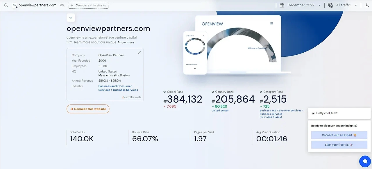 거의 모든 웹사이트에 대해 무료로 제공되는 SEO 친화적인 랜딩 페이지에는 회사 배경, 다른 웹사이트와 비교한 트래픽 순위, 해당 트래픽이 어떻게 보이는지에 대한 유용한 인사이트가 포함되어 있습니다. 따라서 "Google 트래픽 순위" 또는 제 경우에는 "openviewpartners.com 웹사이트 트래픽"과 같은 매우 구체적인 검색에서도 Similarweb을 찾을 수 있습니다.