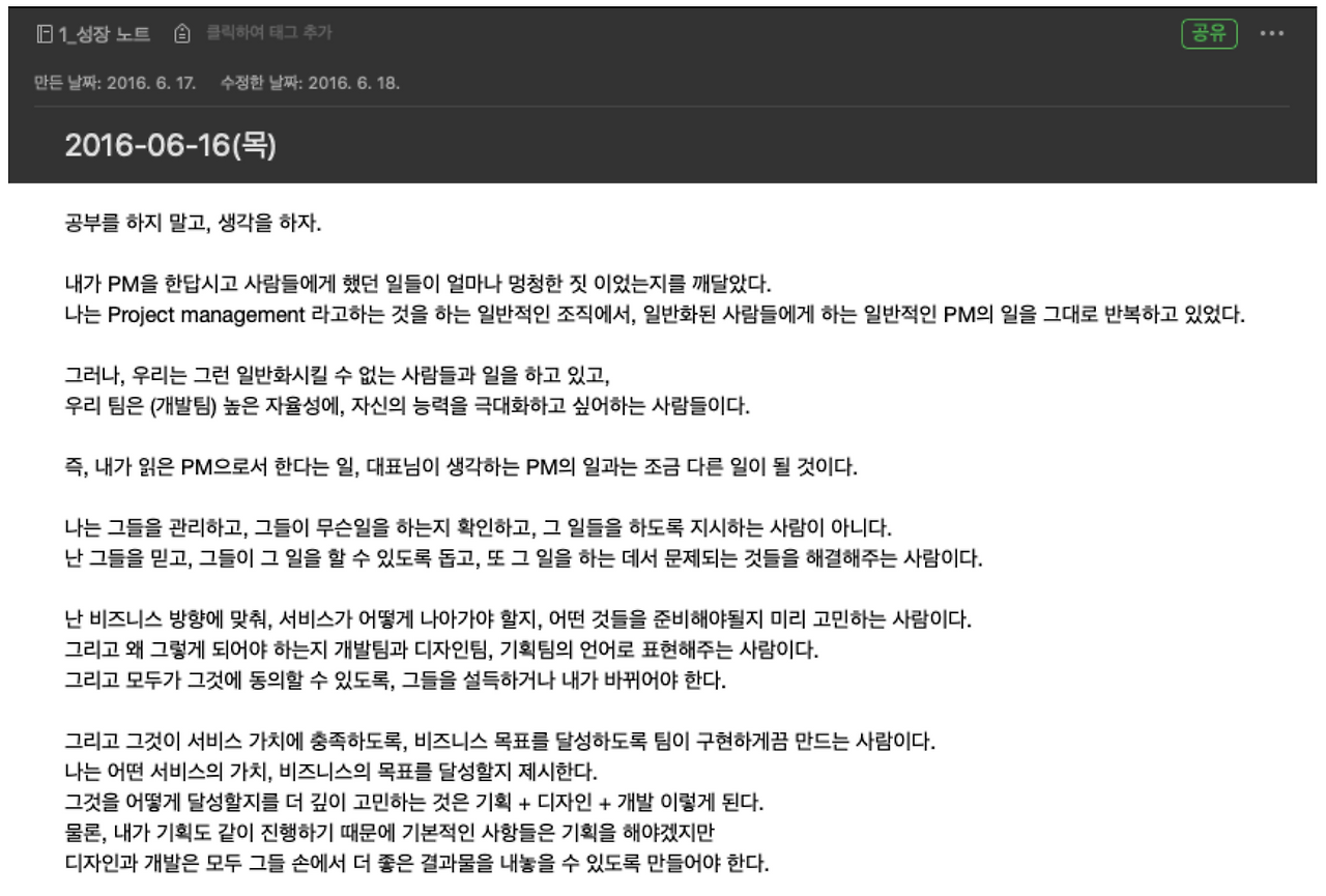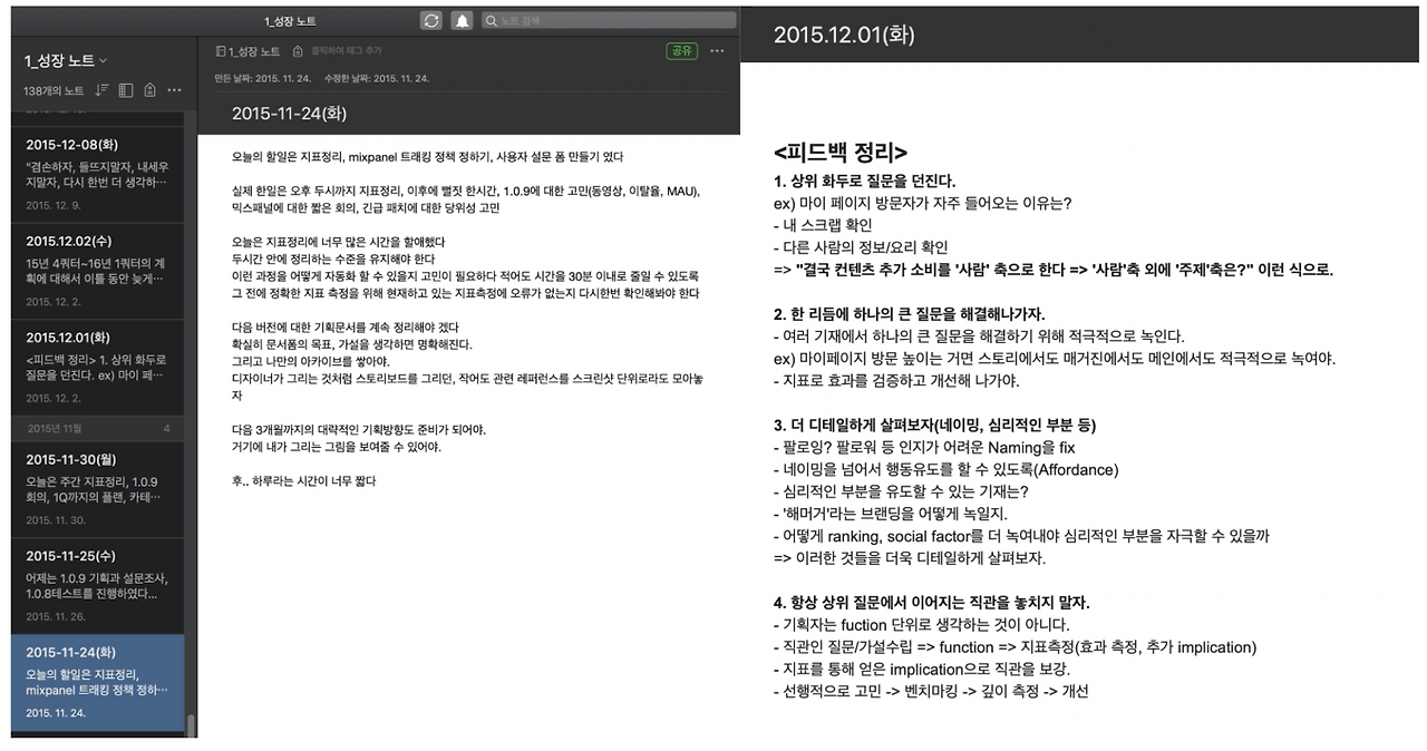 2015년부터 "성장 노트"라는 걸 작성하기 시작했다. "성장노트"는 일기와 같은 형식이지만 주로 업무를 하면서 겪었던 사실과 내가 느꼈던 감상, 앞으로 어떻게 할지에 대해 정리한 글이었다. 매일 내가 한 업무를 돌아보고 회고하는 일종의 업무 일지라고 봐도 무방하다.