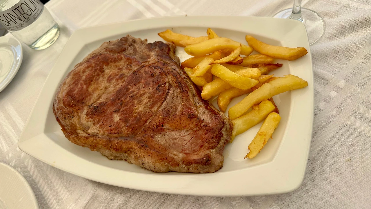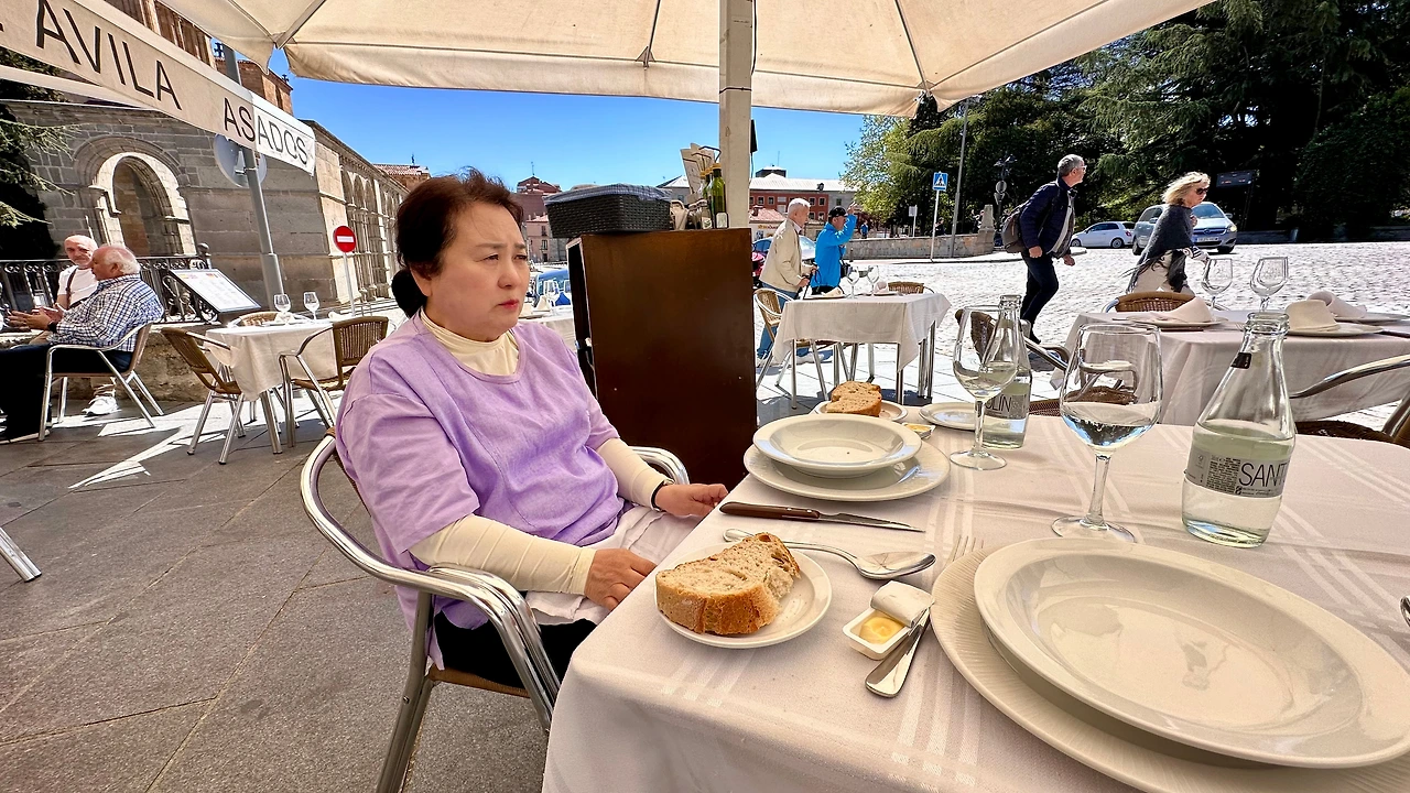 아빌라는 왕갈비구이(Chuleton)가 유명한가 보다. 성벽 오는 길에 보이는 식당 간판에 ‘아빌라의 왕갈비(Chuleton de Avila)’ 란 문구를 자주 보았다. 이 식당도 마찬가지이다. ‘오늘의 메뉴(Menu del Dia)’가 최소 2인 기준 52유로인데 구성을 보니 전식 3가지, 본식 왕갈비 750g, 그리고 후식과 음료이다. 1인당 26유로인 셈인데 참고로 스페인에서 점심식사로 내놓는 ‘오늘의 메뉴’의 가격은 대강 15~25유로이다. 그런데 본식으로 구워 나온 송아지 왕갈비구이 크기가 놀랍다. 이걸 다 먹을 수 있을까? 하고 걱정이 된다. 실제 다 먹지 못하고 남겼다. 과거 4~50대 같았으면 문제없이 먹었겠지만 지금은 어림도 없다.