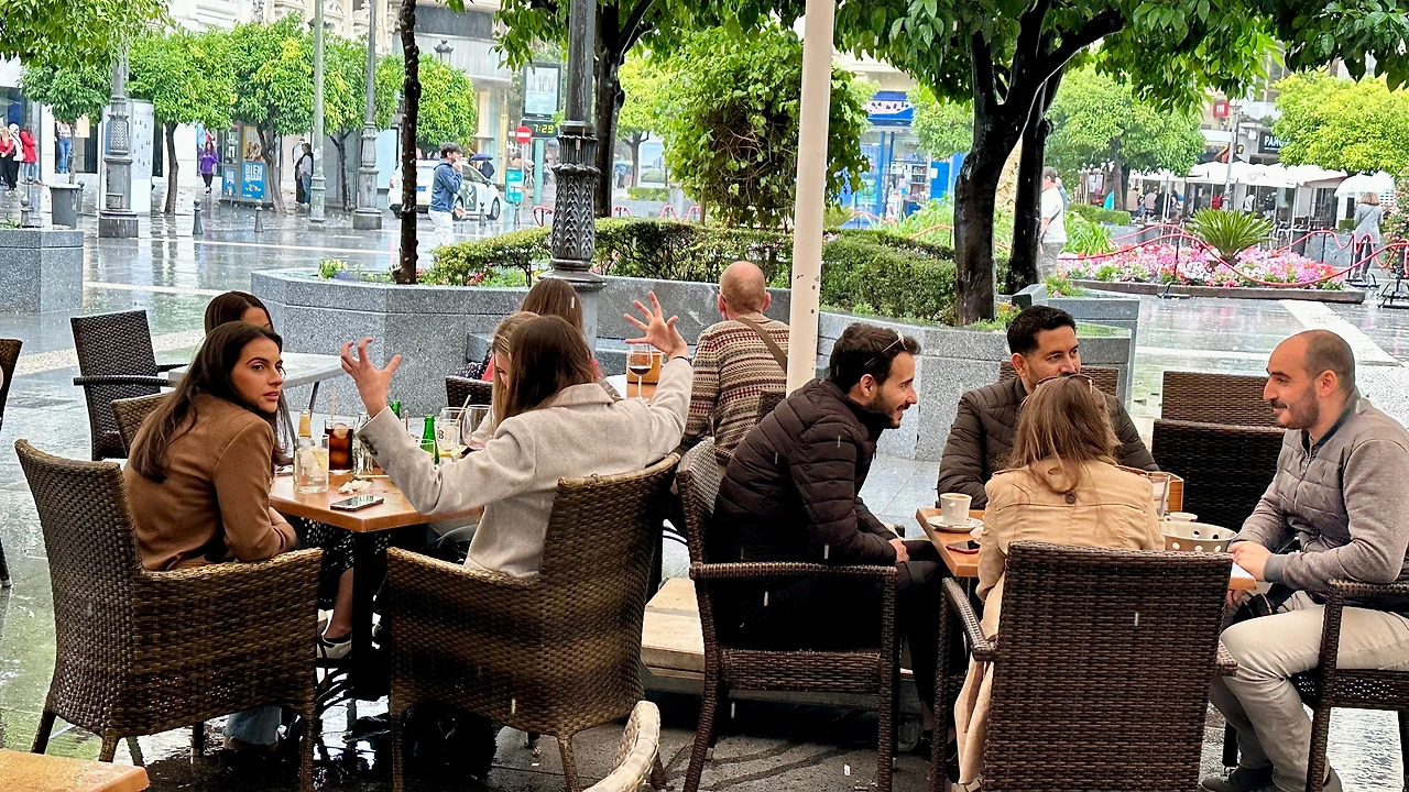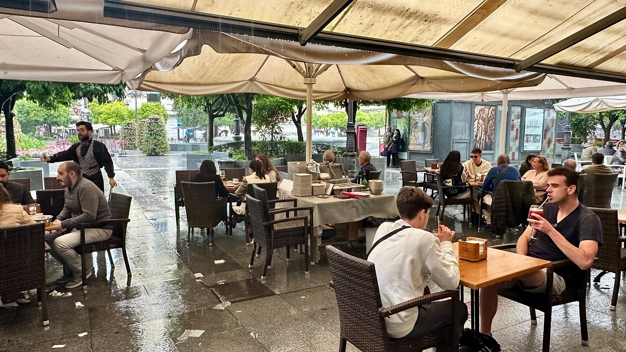 버거킹을 나올 때쯤 천둥 치며 비가 쏟아진다. 조금 전까지 햇살이 있었는데 금세 날씨가 변했다. 조금 기다렸다가 잠시 멈추는 듯해 호텔로 향했더니 다시 비가 세차게 내리친다. 할 수 없이 광장 카페 처마 밑으로 비를 피하는 수밖에 없다. 식당 테라스는 천막으로 덮여있어 우중에도 많은 사람들이 개의치 않고 먹고 마신다.