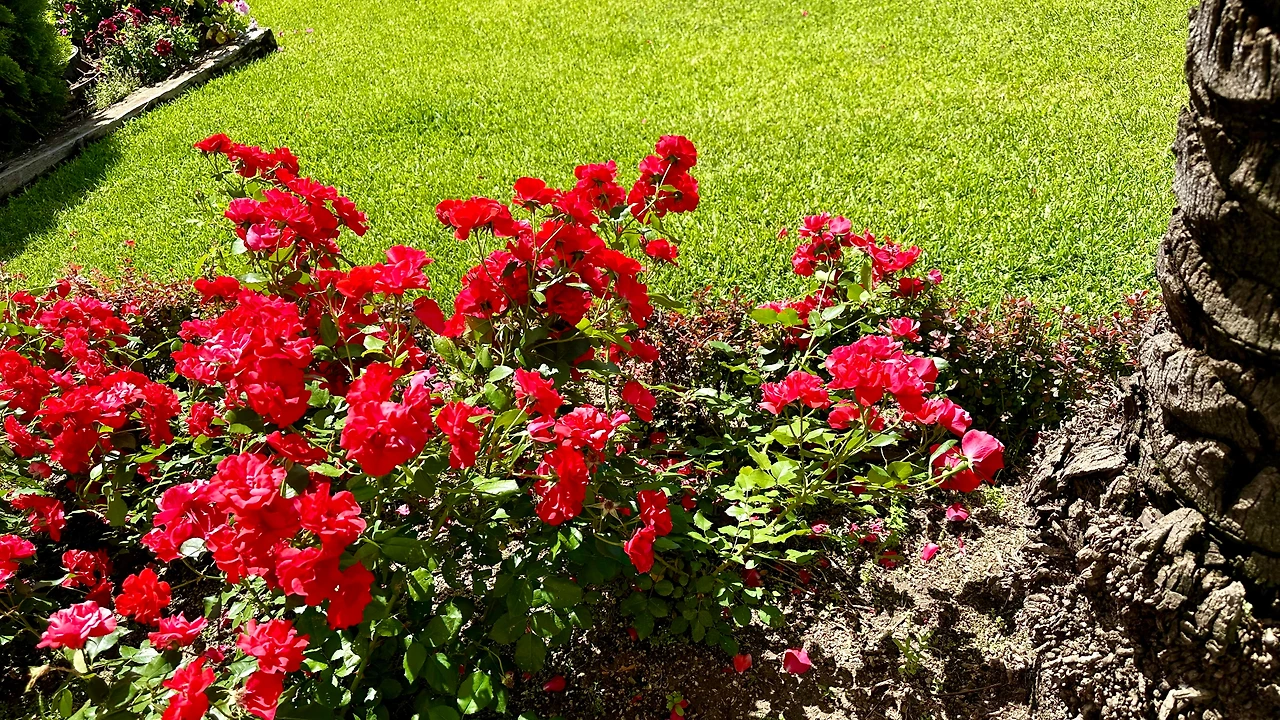 길가의 정원에서 본 장미가 햇빛을 받아 찬란하게 붉은색을 쏟아내며 여행객의 마음을 유혹한다.