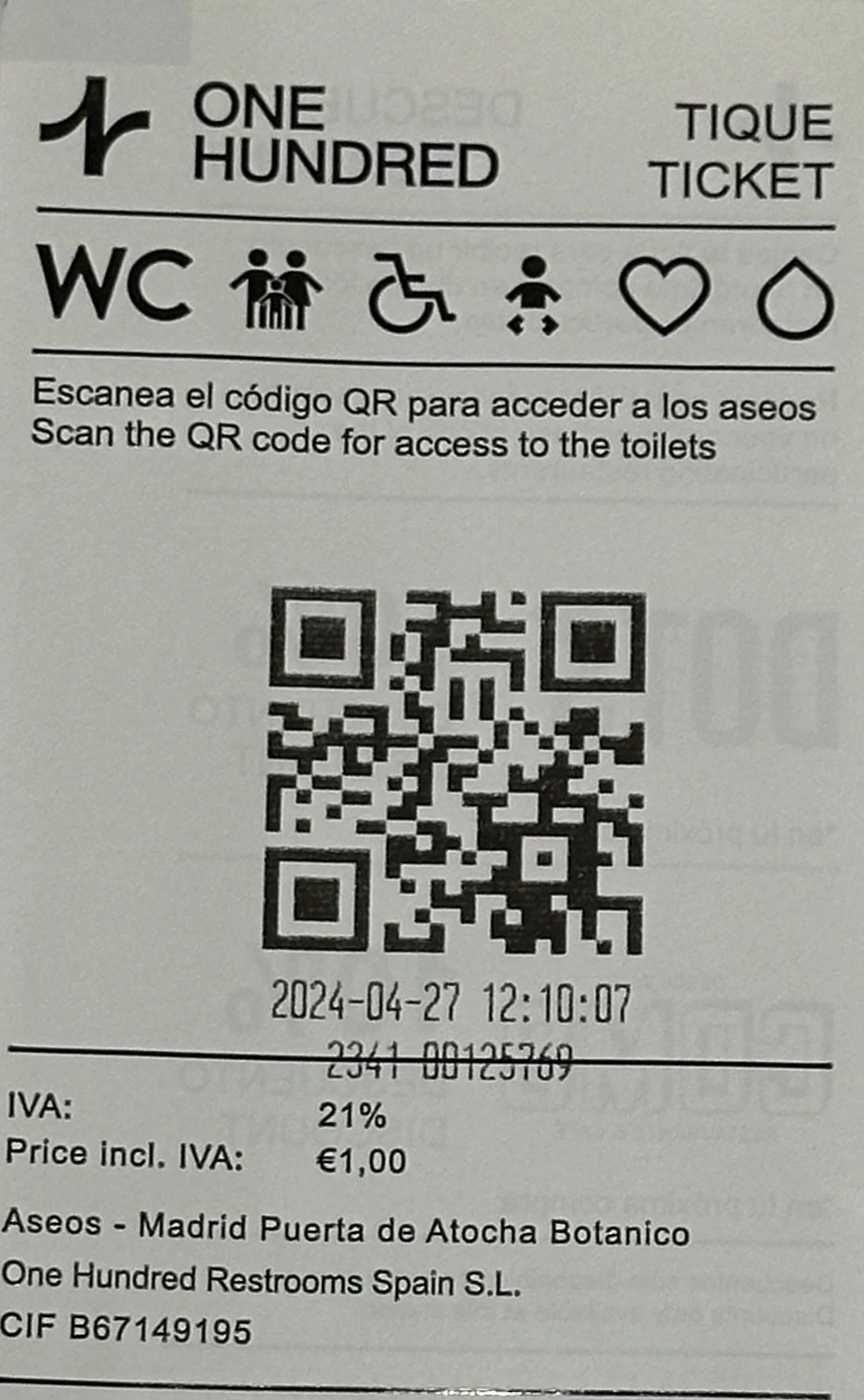 아토차 역의 화장실은 매우 불편하다. 기본적으로 기차역을 단순하게 방문하는 사람들에게는 개방 화장실이 없다. 화장실을 사용하려면 유료인데 사용료가 1유로이다. 소변보는데 1,500원을 내야 한다니... 나도 그렇지만 특히 미국 노인 여행객들이 오~ 하고 놀라며 킥킥거린다. 다만 짐 검사 후에 체크인하고 승객 대합실에 들어가면 개방화장실이 있다.