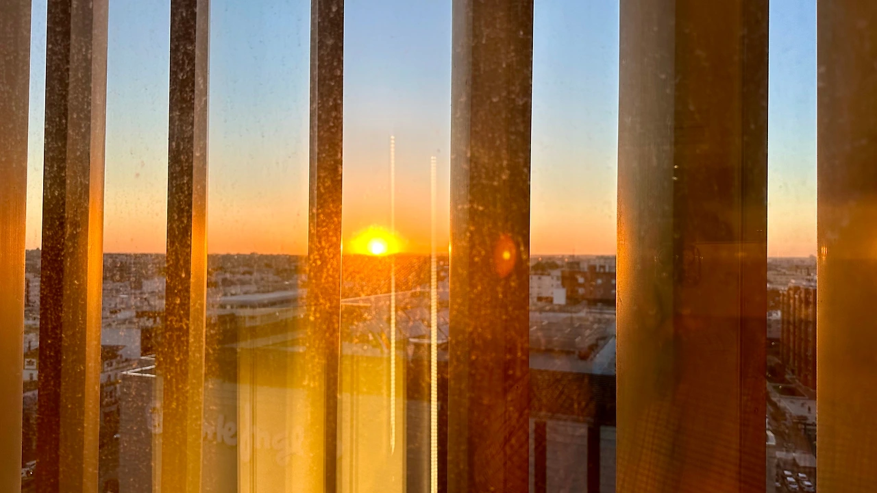 아침에 일어나 방 커튼을 제치니 붉은 해가 떠오른다. 해가 쨍쨍한 날씨가 될 것 같다.