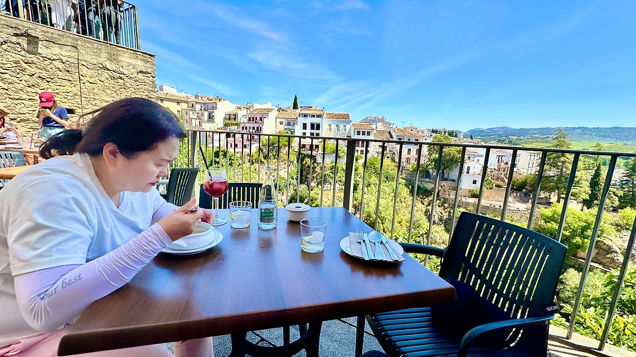 아내와 나는 2017년 왔을 때 커피를 마셨던 식당에서 점심 식사를 하기로 이미 얘기했다. 이 식당은 누에보 다리를 건너자마자 만나는 왼쪽 전망대 아래에 있다. 식당 테라스 자체가 전망대이다.