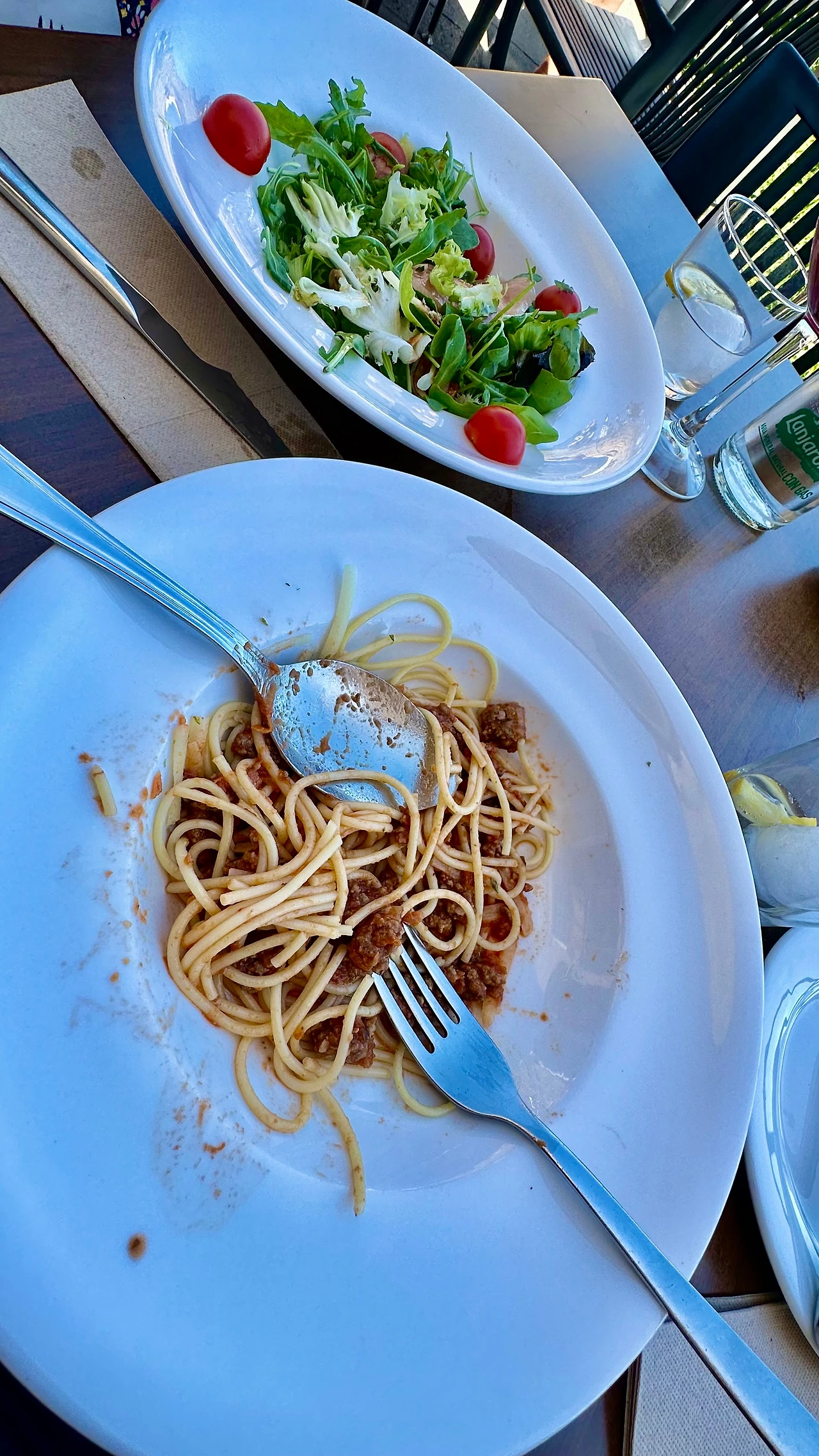다행스럽게 계곡 아래를 전망할 수 있는 자리에 앉아서 식사를 했는데 아내는 샹그리아 한잔 그리고 수프와 연어 샐러드 나는 볼로냐 스파게티를 먹었다. 아내는 매우 만족했고 나는 가성비가 생각나게 하는 수준이었다. 깨끗하게 차려놓고 전망대로 장사하는 식당같은 느낌이다. 다만 아내가 잘 먹었다니 됐다.