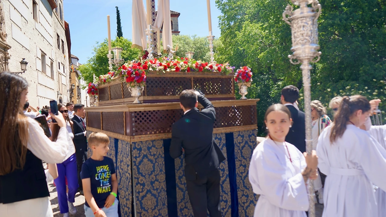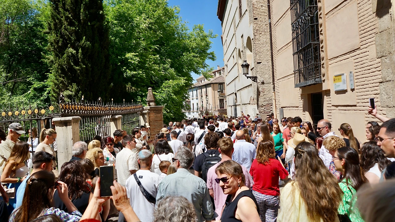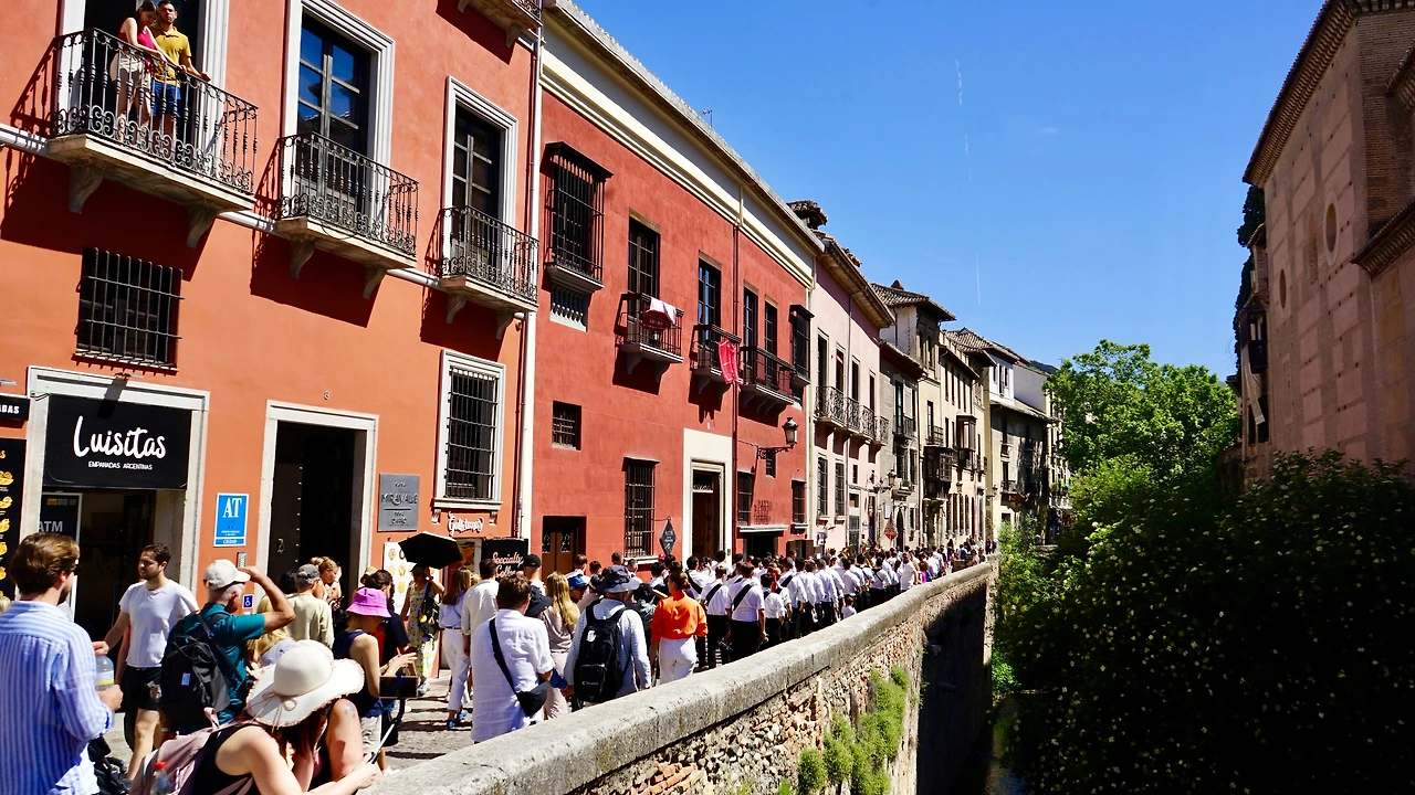 아침 식사를 마치고 성 니콜라스 전망대를 올라가는데 알람브라 숲 올라가는 입구 부근이 드럼 소리로 요란하다. 악대가 줄을 서서 행렬할 준비를 하고 있다. 종교행사가 있는 모양이다. 이 행렬은 성 니콜라스 전망대를 가는 좁은 골목길을 따라 올라간다. 길이 좁아 앞서 갈 수도 없다. 행렬을 천천히 따라간다. 한참 가는 도중 길 오른쪽에 있는 오랜 역사를 가진 성당으로 행렬이 들어가고 우리는 성 니콜라스 전망대에 도착한다.