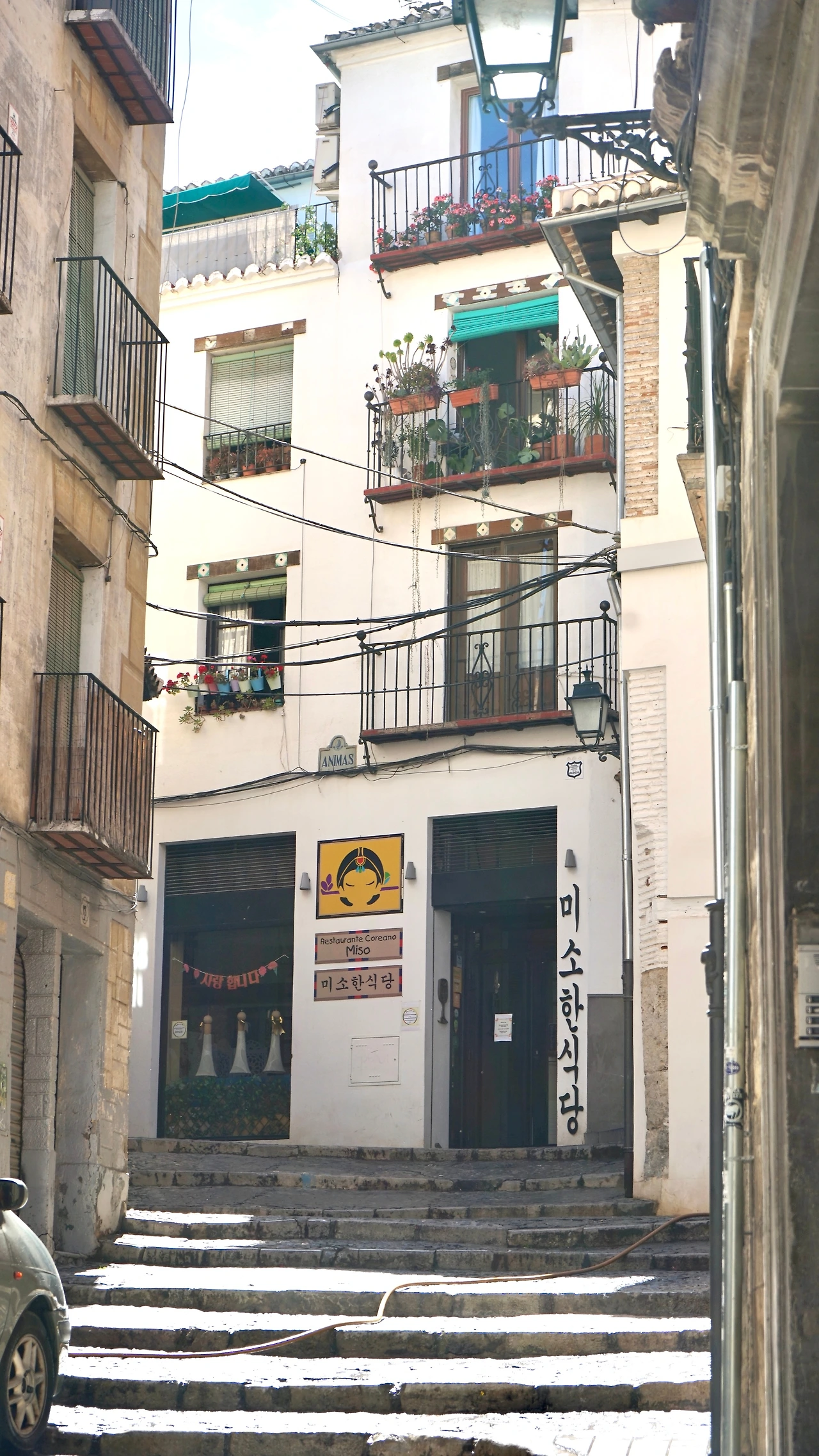 점심식사는 전망대를 가기 전 악대를 만났던 장소에서 알람브라 숲으로 올라가는 언덕길 시작의 끝에 갑자기 보였던 한글 간판의 ‘미소’라는 한국 식당에서 하기로 한다. 어떻게 보면 기가 막힌 자리를 차지하고 있다. 아내는 김치찌개 나는 비빔밥을 주문했는데 아내가 제육 볶음을 먹고 싶다고 해서 추가 주문한다. 그런데 결국 다 먹지를 못하고 남겨 욕심만 부린 꼴이 되었다. 아내는 해외에서 이 정도의 음식 맛이면 된 것이라고 한다. 가격도 현재 내가 경험한 스페인 식당 물가를 생각해 볼 때 조금 더 받아도 되지 않을까 하는 생각이 든다. 내가 들어올 때 한국인 고객들이 있었는데 나갈 때는 모두 현지인으로 차있다.