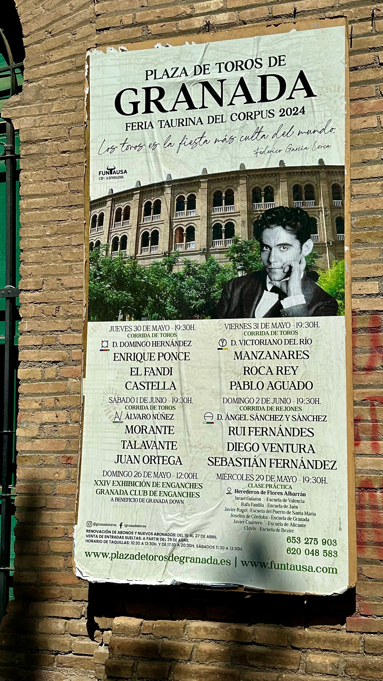 그라나다 투우장은 크지도 그리고 작지도 않은 규모로 보인다. 깔끔하다. 입장권 판매 창구에 표를 예매하기 위해 사람들이 줄 서 있다. 가까이 가서 투우 일정을 보니 5월 26일, 29일, 30일, 31일. 6월1일, 2일 오후 7시 30분에 시작한다. 나는 2001년도에 마드리드 투우장에서 딱 한 번 투우를 보았다. 아주 잘 보이는 곳에서 관람했는데 어떻게 잔인하던지 그 뒤로는 TV로도 투우 경기를 보지 않는다. TV로 보면 소가 칼에 찔려 피나오는 장면이 리얼하게 보이지 않고 흐르는 것 같다. 그러나 가까이에서 보면 피가 공중으로 품어져 나오고 소의 허덕거림과 고통이 그대로 느껴져 참혹하다는 느낌을 받았다. 그 뒤로 나는 아무리 문화적 전통이라고는 하지만 투우 경기를 싫어한다. 그런데 스페인에는 열광하는 사람들이 많다.